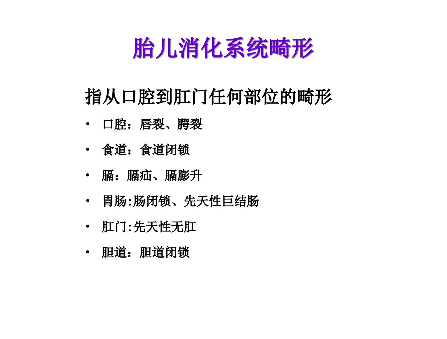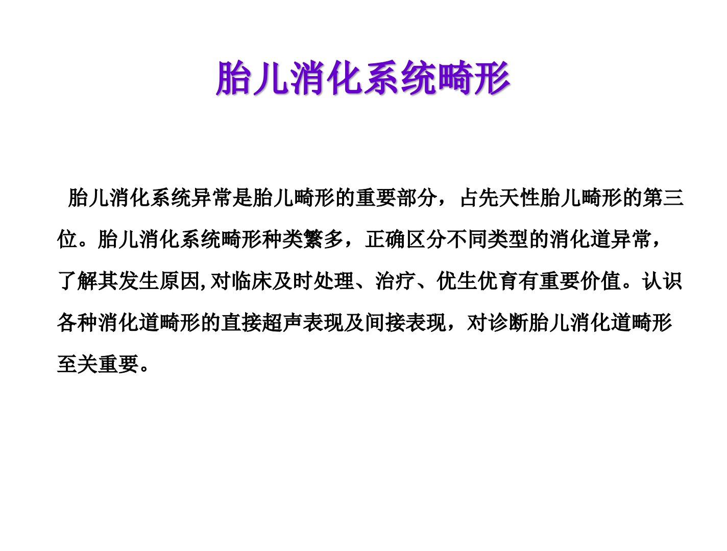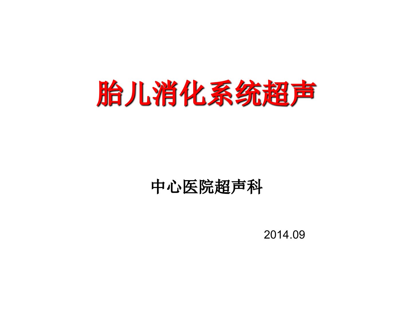 胎儿消化系统超声中心医院超声科2014.09胎儿消化系统畸形胎儿消化系统异常是胎儿畸形的重要部分,占先天性胎儿畸形的第三位。胎儿消化系统畸形种类繁多,正确区分不同类型的消化道异常,了解其发生原因,对临床及时处理、治疗、优生优育有重要价值。认识各种消化道畸形的直接超声表现及间接表现,对诊断胎儿消化道畸形至关重要。胎儿消化系统畸形指从口腔到肛门任何部位的畸形口腔:唇裂、腭裂食道:食道闭锁膈:膈疝、膈膨升胃肠:肠闭锁、先天性巨结肠肛门:先天性无肛胆道:胆道闭锁消化系统的发生胚胎第3周内胚层被转入胚体原始消化管,分化为前肠、中肠、后肠。胚胎第三周,内胚层原始消化管前肠中肠后肠尿囊卵黄蒂胚胎第五周分化为...