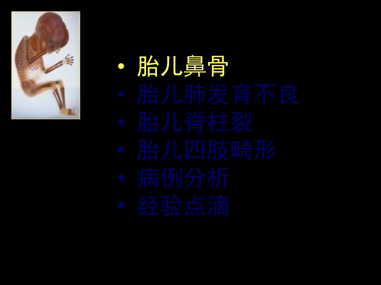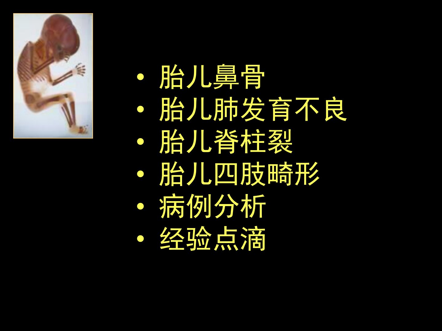 本文围绕胎儿骨骼系统超声检查分析了胎儿鼻骨、肺发育不良、脊柱裂及四肢畸形病例。胎儿鼻骨方面早孕期1114周超声检查运用鼻骨缺失作为评价标准可检出73唐氏综合征患儿假阳性率为05中孕期1522周25mm或缺失为异常。胎儿肺发育不良主要根据心胸比值增大等异常诊断双侧肺发育不良预后严重产后无法生存其严重程度与羊水过少出现孕周、持续时间及程度有关。胎儿脊柱裂是脊椎中线缺损分开放性与闭合性开放性脊柱裂病变部位皮肤连续性中断好发于腰骶段闭合性脊柱裂皮肤连续性完整。胎儿四肢畸形方面18三体胎儿手重叠且张不开严重结构畸形如双前臂缺失等也需关注。此外还分享了诊断经验如常备表格、早孕期骨骼肢体畸形与NT增厚有关、熟悉致死性骨骼发育不良分类等。