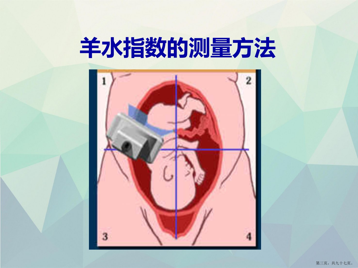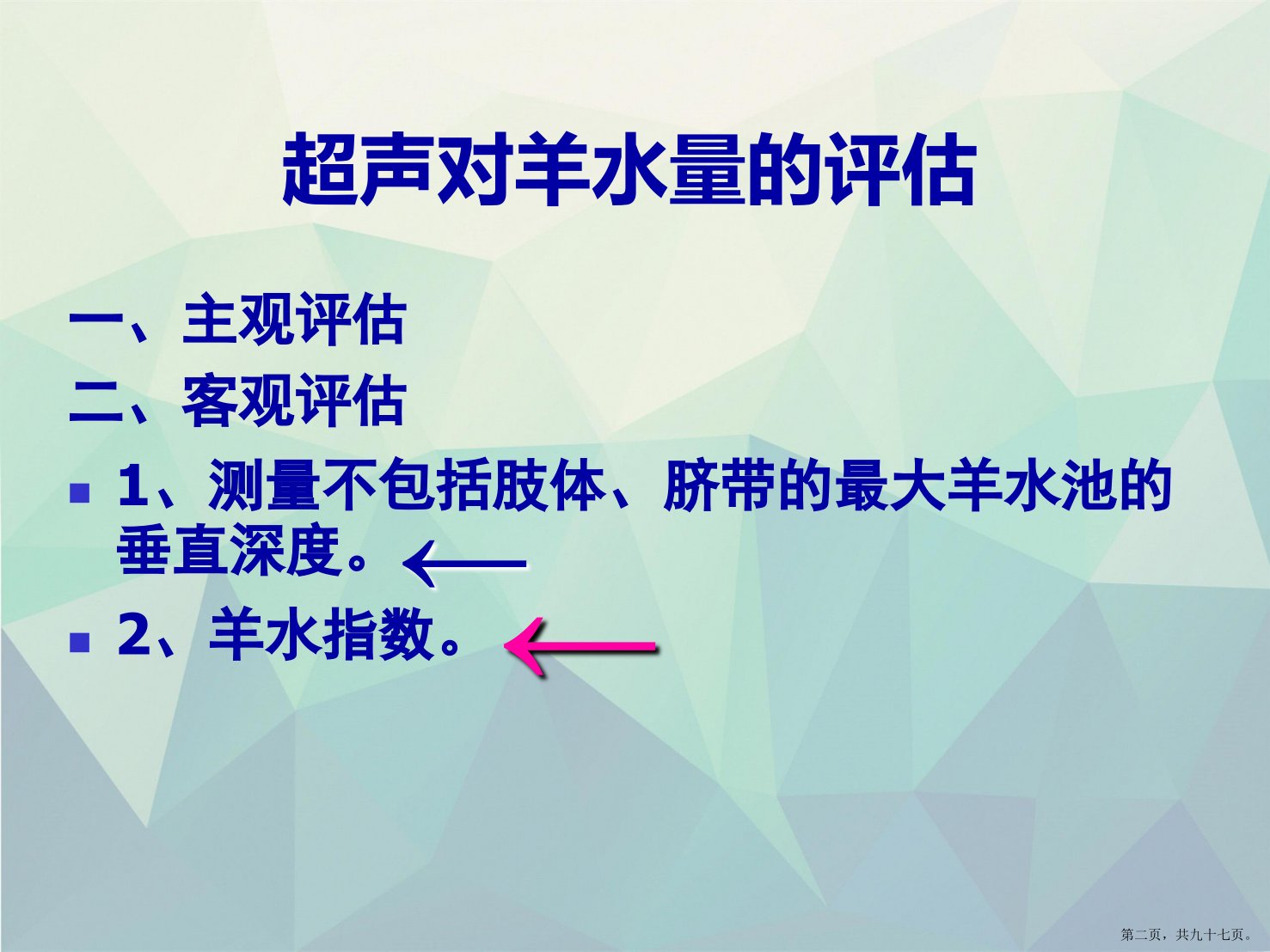本文介绍了超声在产前诊断中的多方面应用。首先超声对羊水量的评估分为主观和客观评估客观评估包括测量最大羊水池垂直深度和羊水指数羊水过少或过多均是胎儿危险信号产生原因多样包括胎儿畸形、染色体异常等。其次脐血管异常也是检查重点包括数目、途径、连接、结构或形态等方面的异常如双血管脐带、帆状脐带入口、脐动脉发育不全等还可能存在出血、囊肿、肿瘤、打结等情况。此外超声还可检查胎盘异常包括大小、形状、粘附种植、实质等方面的异常如胎盘过小或过大、单胎多叶胎盘、前置胎盘、粘连性胎盘等。不过超声检查存在局限性如胎盘早剥确诊率低需结合临床确诊或排除。文章最后列举了参阅书籍并感谢聆听欢迎交流。