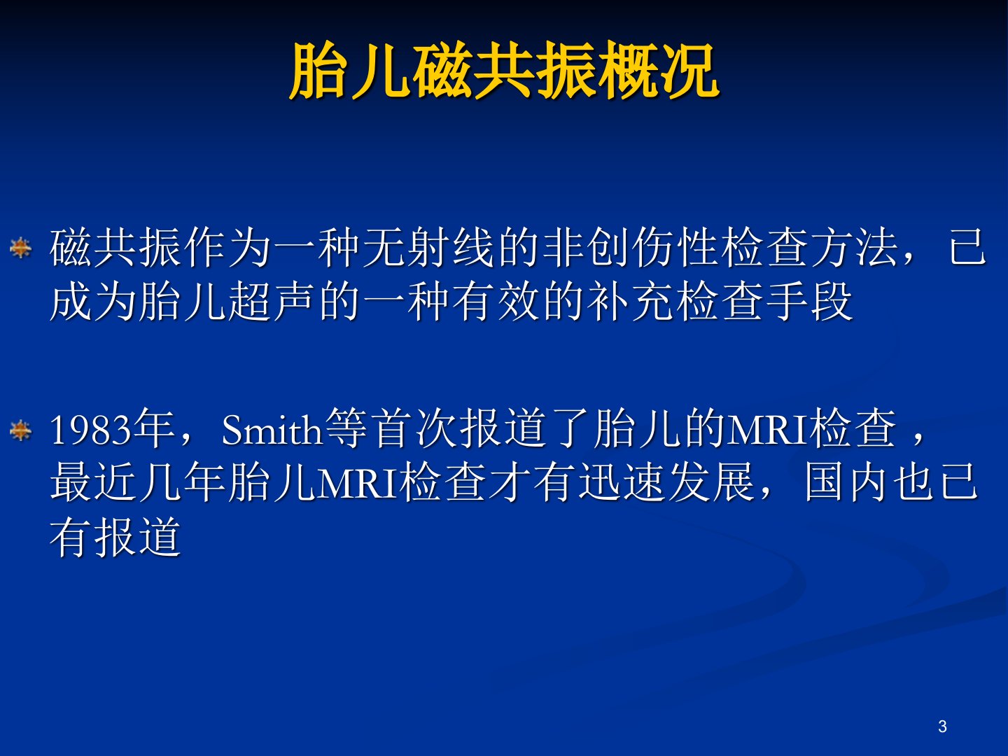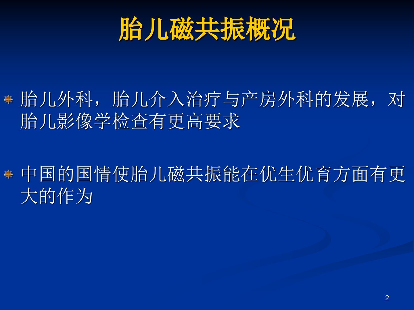 磁共振作为无射线、非创伤性检查是胎儿超声的有效补充近年来发展迅速。胎儿超声检查无创、快速、廉价、准确但存在视野小、对肥胖等情况显示欠佳等不足。胎儿磁共振软组织对比分辨率高受母体影响小可精确切面扫描和测量图像便于保存和会诊但在检查时间、费用、运动伪影控制、胎儿心脏和四肢诊断效果方面存在不足。目前研究表明MRI对胎儿发育产生不良影响的可能性极小检查时孕妇一般不使用镇静剂和增强对比剂孕16周后图像易理解。胎儿磁共振有多种技术可应用于胎儿各系统诊断尤其在中枢神经系统、羊水过少相关疾病和胸部疾病诊断方面优势较大。对于孕妇过度肥胖、羊水过少等情况胎儿磁共振有明显优势可确认超声诊断。胎儿磁共振也是目前研究热点具有广阔前景和挑战。