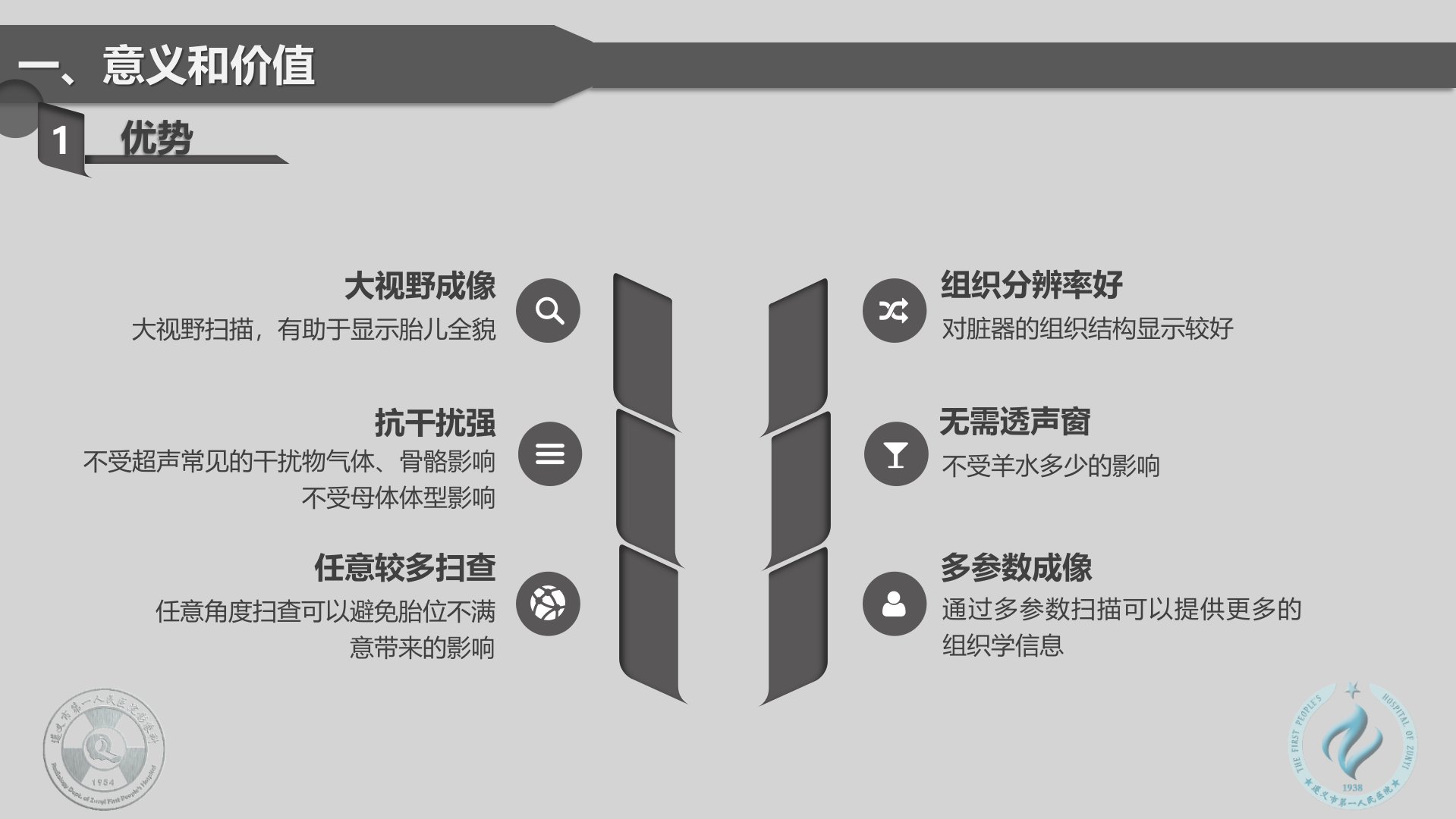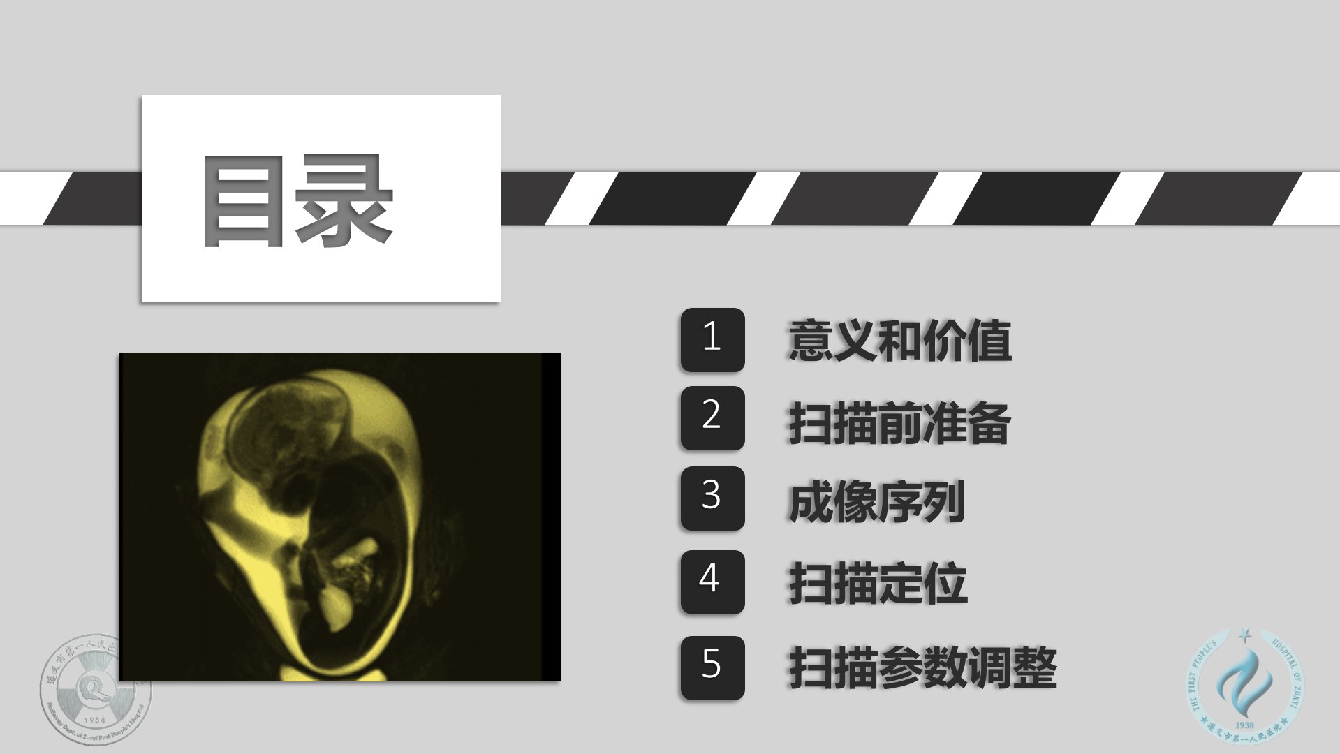 遵义市第一人民医院影像科刘家骥介绍了胎儿磁共振扫描技术。该技术意义和价值在于组织分辨率高不受羊水多少、母体体型等影响可多参数、大视野成像适应范围包括超声异常需进一步明确的畸形、母体肥胖等情况。安全性方面磁共振仪器会产生静磁场、使组织升温、产生周围神经刺激症状和噪声等影响应对措施包括采用合适场强、控制SAR值、优化流程缩短时间等。最佳检查时间段ACR推荐18W以后方便与超声对照且有利临床决策。设备选择上2002年美国FDA通过了30T对胎儿的磁共振检查。扫描前需预约告知、评估孕妇情况、注意“四不原则”。序列选择常用单次激发快速自旋回波序列、稳态自由进动序列等各有优缺点。扫描定位需按胎儿解剖方位重新定位。扫描参数调整需考虑安全性、图像质量等因素。