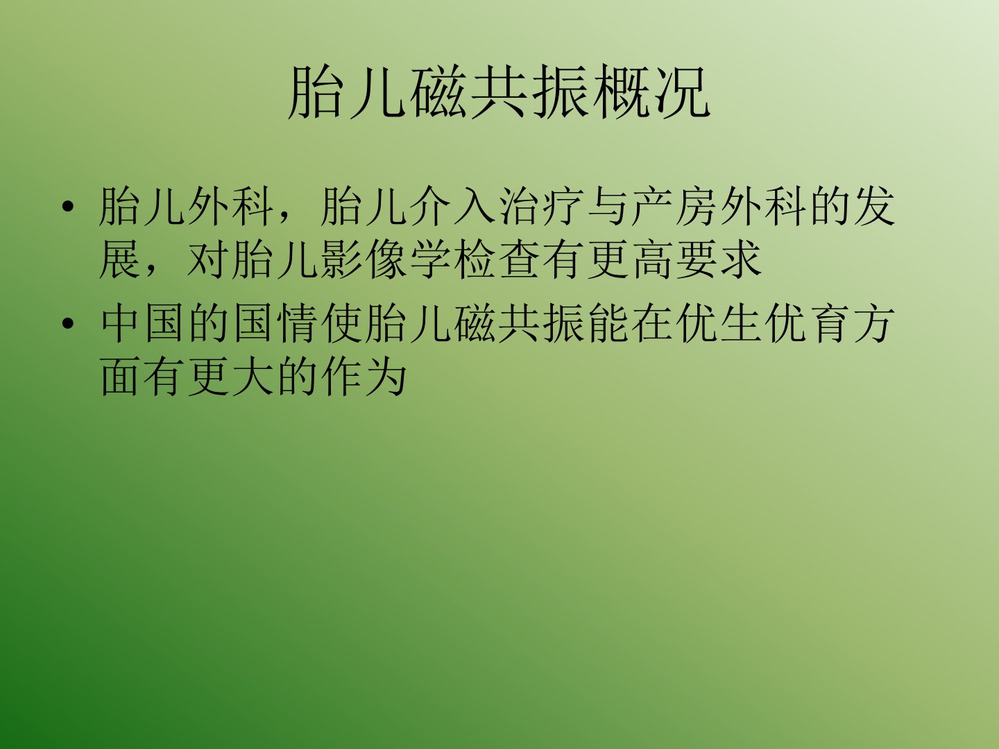 胎儿磁共振检查技术在胎儿影像检查中具有重要地位。随着胎儿外科、胎儿介入治疗与产房外科的发展对胎儿影像学检查提出了更高要求胎儿磁共振检查优势明显。其优势包括:软组织对比度分辨率高、对母亲影响小、不受胎儿骨骼及羊水量影响在显示胎儿中枢神经系统、羊水过少、双胎及孕周较大时优于超声视野大可显示胎儿全貌能精确扫描和测量对胎儿组织定性良好图像便于保存和会诊受操作者技术水平影响小。不过该技术也有不足如检查时间长、声音响、费用贵等且对胎儿心脏和四肢诊断效果略差。胎儿磁共振可用于双胎、联体胎儿、颅脑、胸部、腹部、肢体、面颈部等多部位检查能诊断多种先天性畸形和疾病对较大肿块定位准确进而定性但四肢检查较易漏诊。
