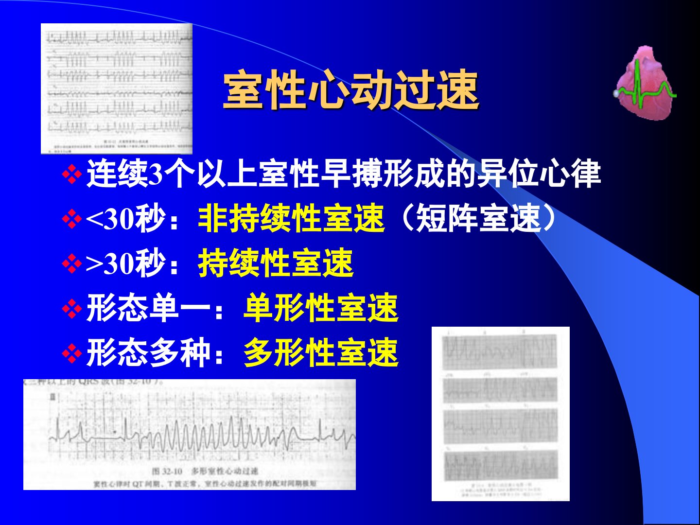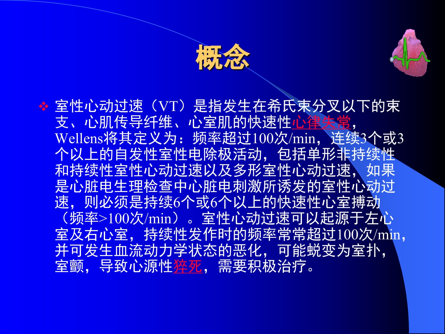 室性心动过速(VT)是发生在希氏束分叉以下部位的快速性心律失常Wellens定义为频率超100次min、连续3个或以上自发性室性电除极活动包括单形、多形非持续性和持续性室性心动过速心脏电生理检查中诱发的需持续6个或以上快速性心室搏动。其可起源于左右心室持续性发作频率常超100次min可能恶化成室扑室颤导致心源性猝死。发作时患者症状不一可能有心慌等症状非持续性者通常无症状。体征上听诊心率轻度不规则心电图可确诊。其类型多样如非阵发性室性心动过速、并行心律性室性心动过速等各有心电图特征。室性心动过速需与室上性心动过速等鉴别。治疗包括终止室速发作及预防复发一般无器质性心脏病者发生非持续性室速无症状及晕厥发作无需治疗;有器质性心脏病或持续性室速需治疗方法有药物治疗、直流电复律、经导管射频消融术、体内埋藏式转复除颤器(ICD)治疗等。