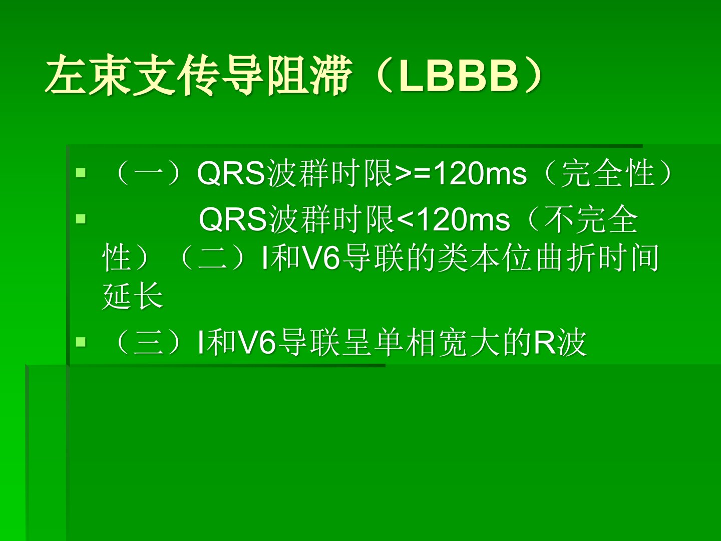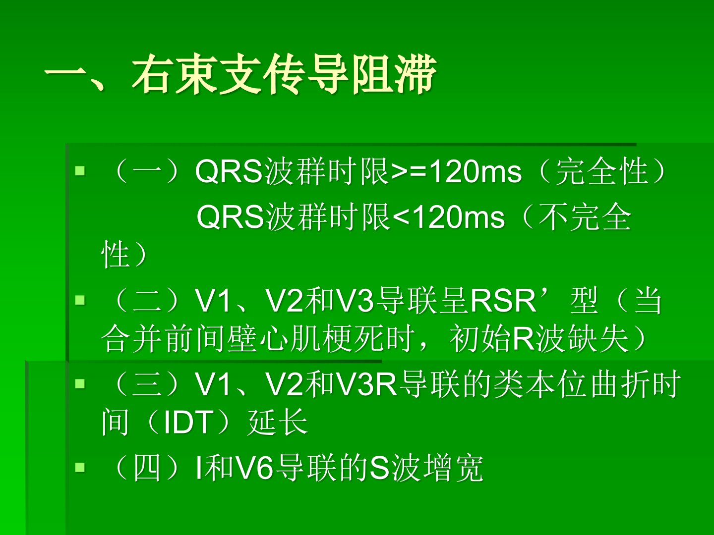临床心电图中室内传导阻滞主要包括以下几种类型:1右束支传导阻滞:QRS波群时限达120ms(完全性)V1导联类本位曲折时间延长呈RSR’形I和V6导联S波增宽。不完全性右束支传导阻滞时QRS波群时限虽轻度延长但小于120ms。2左束支传导阻滞:QRS波群时限120ms(完全性)I和V6导联类本位曲折时间延长并呈单相R波。3非特异性室内传导阻滞:QRS波群时限120ms波形既不符合右束支也不符合左束支传导阻滞。4左前分支传导阻滞:额面电轴左偏45度I和aVL导联有小Q波QRS波群时限轻微延长无左房疾患其他病因。5右后分支传导阻滞:电轴右偏100度I导联S波加深III导联出现小Q波QRS波群时限轻微延长无右房疾患其他病因。此外心电图分析还需关注窦性心律变化、双房肥大、心肌梗死等合并情况。