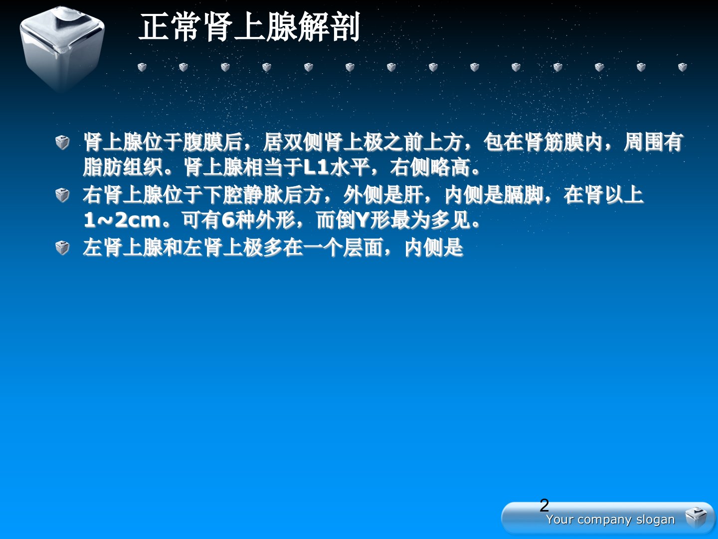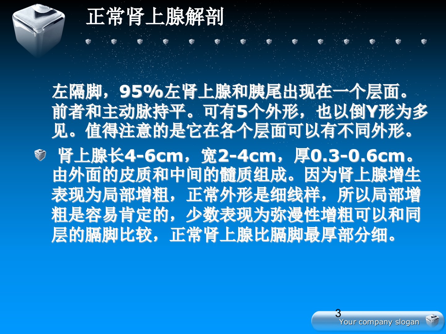 肾上腺疾病CT读片正常肾上腺解剖肾上腺位于腹膜后,居双侧肾上极之前上方,包在肾筋膜内,周围有脂肪组织。肾上腺相当于L1水平,右侧略高。右肾上腺位于下腔静脉后方,外侧是肝,内侧是膈脚,在肾以上1~2cm。可有6种外形,而倒Y形最为多见。左肾上腺和左肾上极多在一个层面,内侧是左隔脚,95%左肾上腺和胰尾出现在一个层面。前者和主动脉持平。可有5个外形,也以倒Y形为多见。值得注意的是它在各个层面可以有不同外形。肾上腺长4-6cm,宽2-4cm,厚0.3-0.6cm。由外面的皮质和中间的髓质组成。因为肾上腺增生表现为局部增粗,正常外形是细线样,所以局部增粗是容易肯定的,少数表现为弥漫性增粗可以和同层的膈...