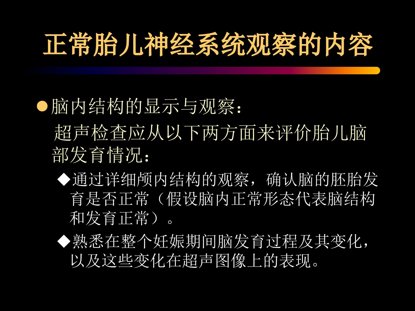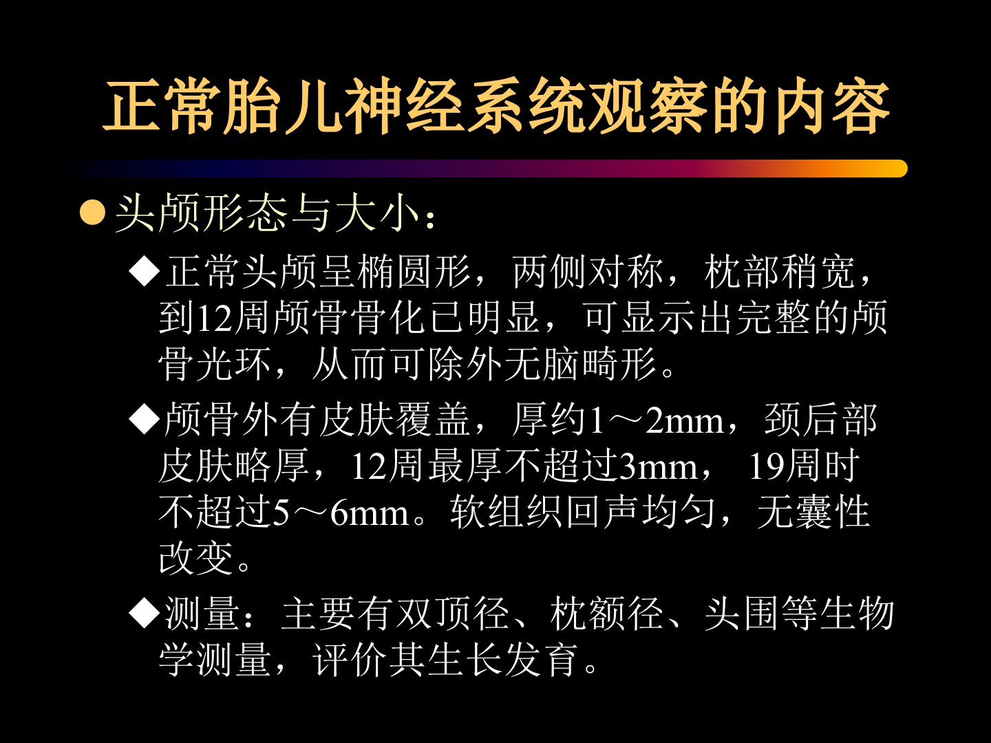 胎儿神经系统畸形超声诊断正常骨化的颅骨(箭头所示)回声强于脑中线(Fx),探头侧颅内结构显示欠清。颅骨骨化差时颅骨(箭头所示)回声较脑中线(Fx)回声为低,探头侧颅内结构显示清楚。观察与显示脑内结构的主要平面丘脑水平横切面(A)侧脑室水平横切面(B)经小脑横切面(C)通过这三个切面的系统观察,95%的中枢神经系统明显畸形可以检测出来胎儿中枢神经系统畸形的超声诊断思维分析方法中枢神经系统畸形的超声诊断思维分析方法总的原则中枢神经系统畸形的超声诊断思维分析方法中枢神经系统畸形的超声诊断思维分析方法中枢神经系统畸形的超声诊断思维分析方法中枢神经系统畸形的超声诊断思维分析方法小脑幕上脑室系统异常:主要...