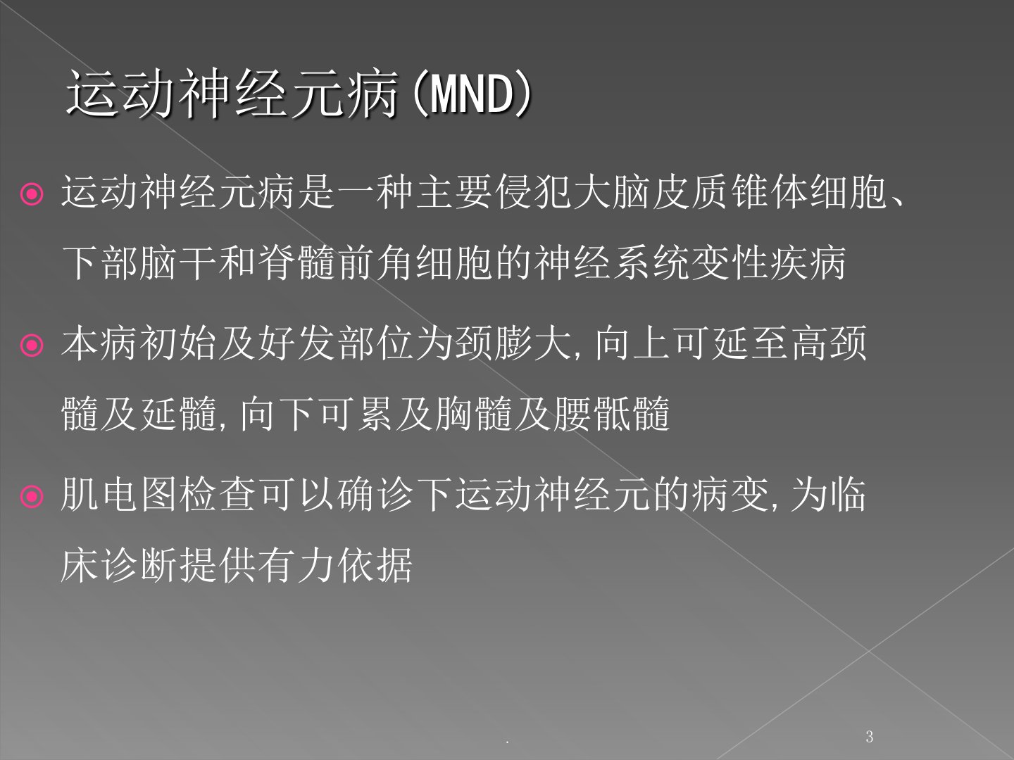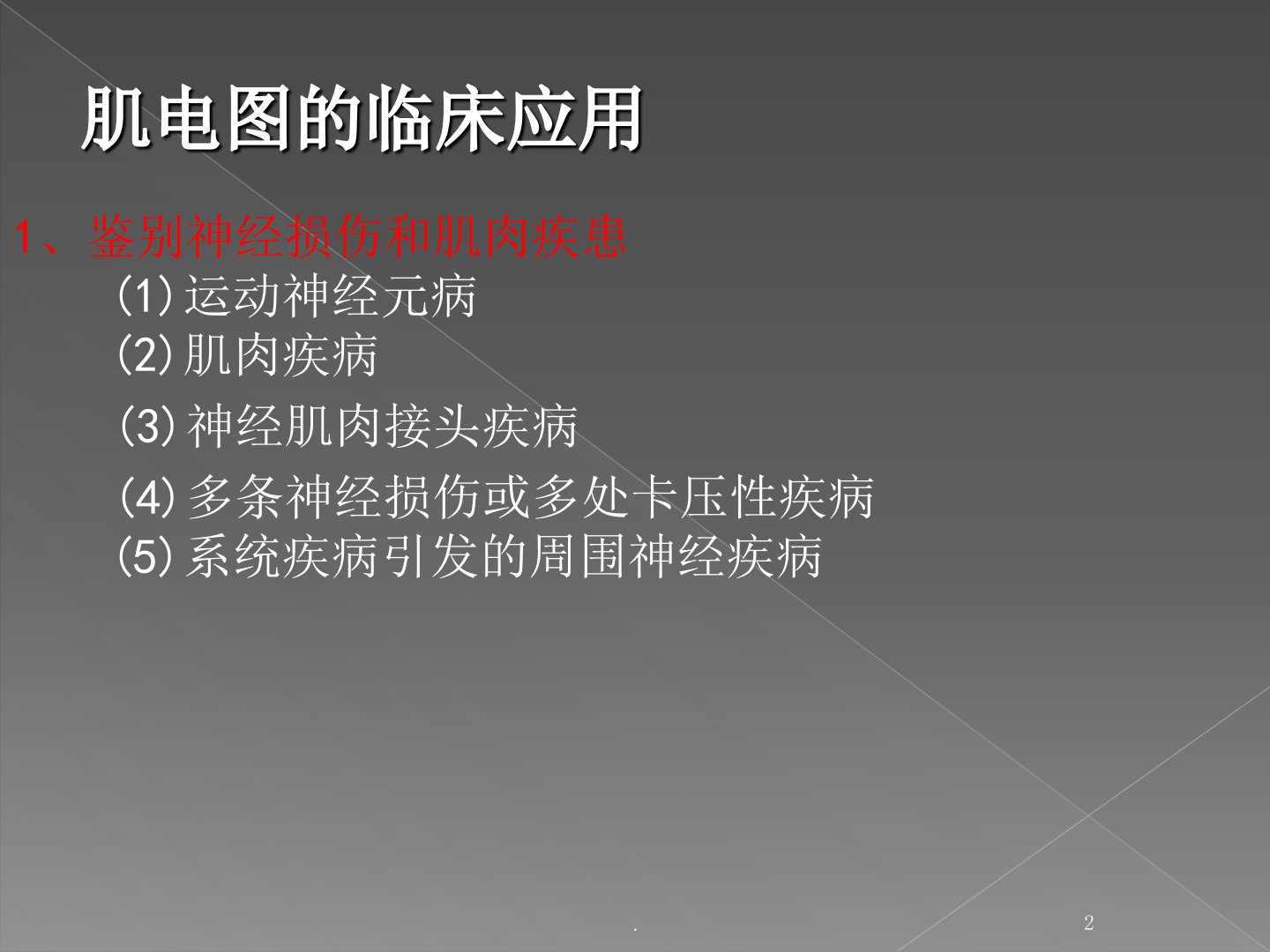 神经科疾病的肌电图诊断摘要肌电图在神经科疾病诊断中应用广泛可用于鉴别神经损伤和肌肉疾患等多种病症。1运动神经元病(MND):是侵犯大脑皮质锥体细胞等的变性疾病。肌电图可确诊下运动神经元病变临床分型多样。早期运动神经传导速度基本正常后CMAP波幅下降等胸锁乳突肌肌电图异常阳性率高有显著诊断意义还需与颈椎病性脊髓病变等鉴别。2肌肉疾病:临床分型包括炎性肌病等多种。电生理特征为常规神经传导速度正常肌电图有典型肌源性损害改变需与神经肌肉接头疾病等鉴别。3神经肌肉接头疾病:是神经肌肉接头传递障碍疾病临床分型有重症肌无力等。电生理特征上重复神经电刺激有确诊价值不同类型刺激波幅变化不同还需与肌无力综合征、肌病等鉴别。