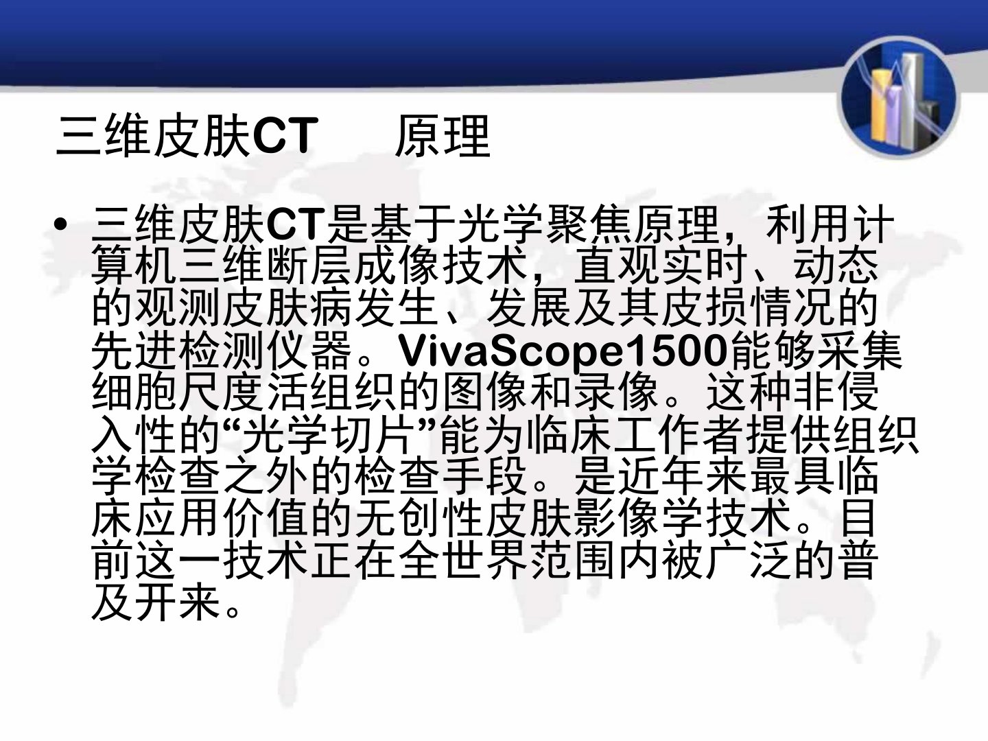 三维皮肤CT是基于光学聚焦与计算机三维断层成像技术的复合型仪器可直观、实时、动态地观测皮肤病发生、发展、疗效及皮损情况。与传统病理活检相比它具有无创无痛、病人舒适度高、检查迅速等优点。该仪器通过激光点光源和双针孔装置形成物象共轭可对皮肤进行左右扫描、上下移动聚焦成像获得同一断层面的图像经计算机处理后能从任意角度观察标本的三维剖面或整体结构。其最大优点是无创性不会造成肿瘤转移可维持细胞组织的正常形态和生理功能利于在生理状态下了解组织结构及代谢过程并可实时动态监测。皮肤ct可观察许多可疑病灶无需取材及组织病理学复杂过程。其应用范围广泛可检查病种包括白癜风、牛皮癣等多种皮肤病。使用时需严格执行运行记录制度并配有稳定电源同时需经常清洁设备物镜等组件。