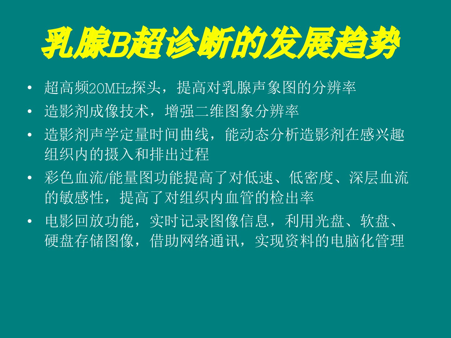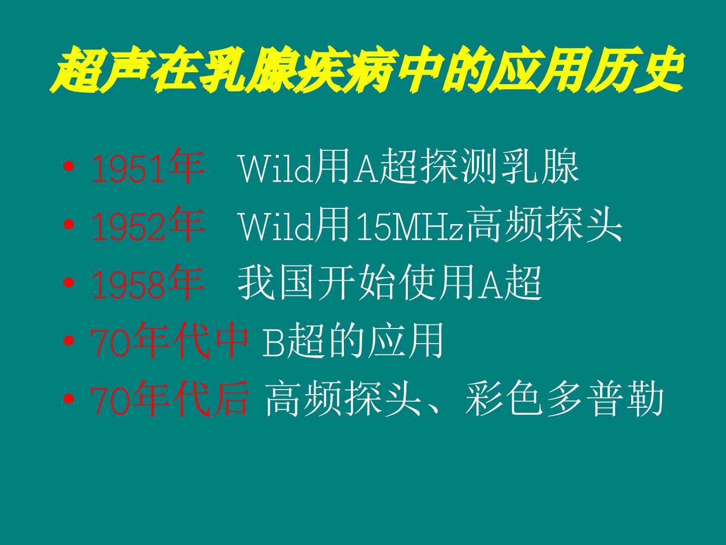 乳腺超声诊断1951年Wild用A超探测乳腺1952年Wild用15MHz高频探头1958年我国开始使用A超70年代中B超的应用70年代后高频探头、彩色多普勒超声在乳腺疾病中的应用历史乳腺B超诊断的发展趋势超高频20MHz探头,提高对乳腺声象图的分辨率造影剂成像技术,增强二维图象分辨率造影剂声学定量时间曲线,能动态分析造影剂在感兴趣组织内的摄入和排出过程彩色血流/能量图功能提高了对低速、低密度、深层血流的敏感性,提高了对组织内血管的检出率电影回放功能,实时记录图像信息,利用光盘、软盘、硬盘存储图像,借助网络通讯,实现资料的电脑化管理超声在乳腺疾病诊断中的意义简便、易行,适于普查无疼痛、无损伤、...