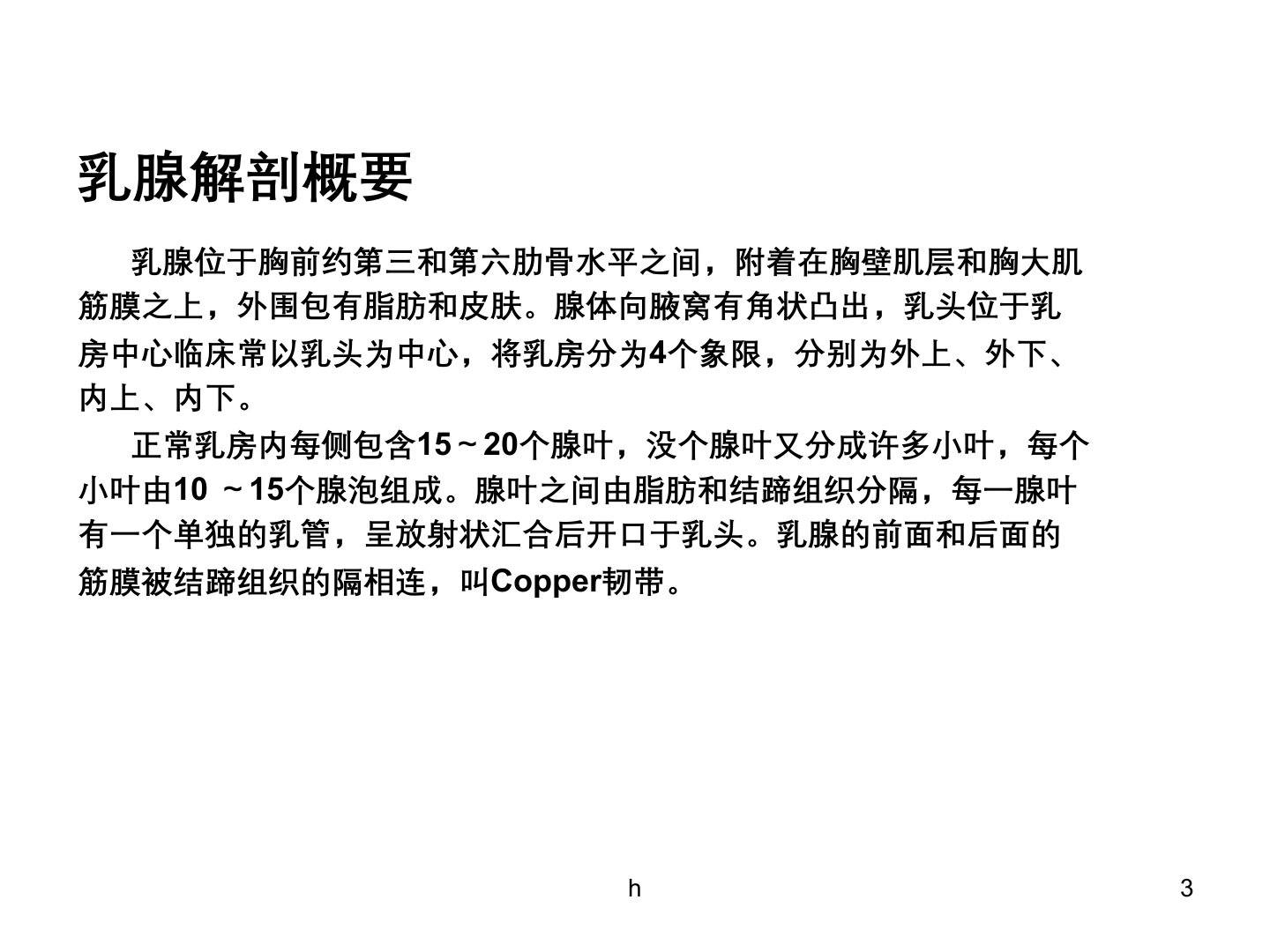 乳腺超声检查摘要乳腺位于胸前第三至第六肋骨间附着于胸壁肌层和胸大肌筋膜之上每侧包含1520个腺叶。正常乳房超声显示皮肤、皮下筋膜和脂肪、腺体、Cooper韧带及胸肌和胸壁结构。正常乳腺声像图分为四型即导管型、混合型、致密型和不均匀型。急性乳腺炎多发生于产后哺乳期致病菌多为金黄色葡萄球菌可形成脓肿。超声可确定是否形成脓肿了解其范围指导治疗。乳腺增生症主要表现为乳房胀痛等超声可确定有无局限性肿块排除肿瘤可能。乳腺良性肿瘤以纤维腺瘤最常见超声可确定肿瘤位置、大小等并判断性质。乳腺癌发病率最高超声表现包括异常回声、边界不整等彩色多普勒可显示血流情况。副乳为多余乳头和乳房男女均可发生超声可显示其腺体特征性结构是诊断副乳的首选方法。