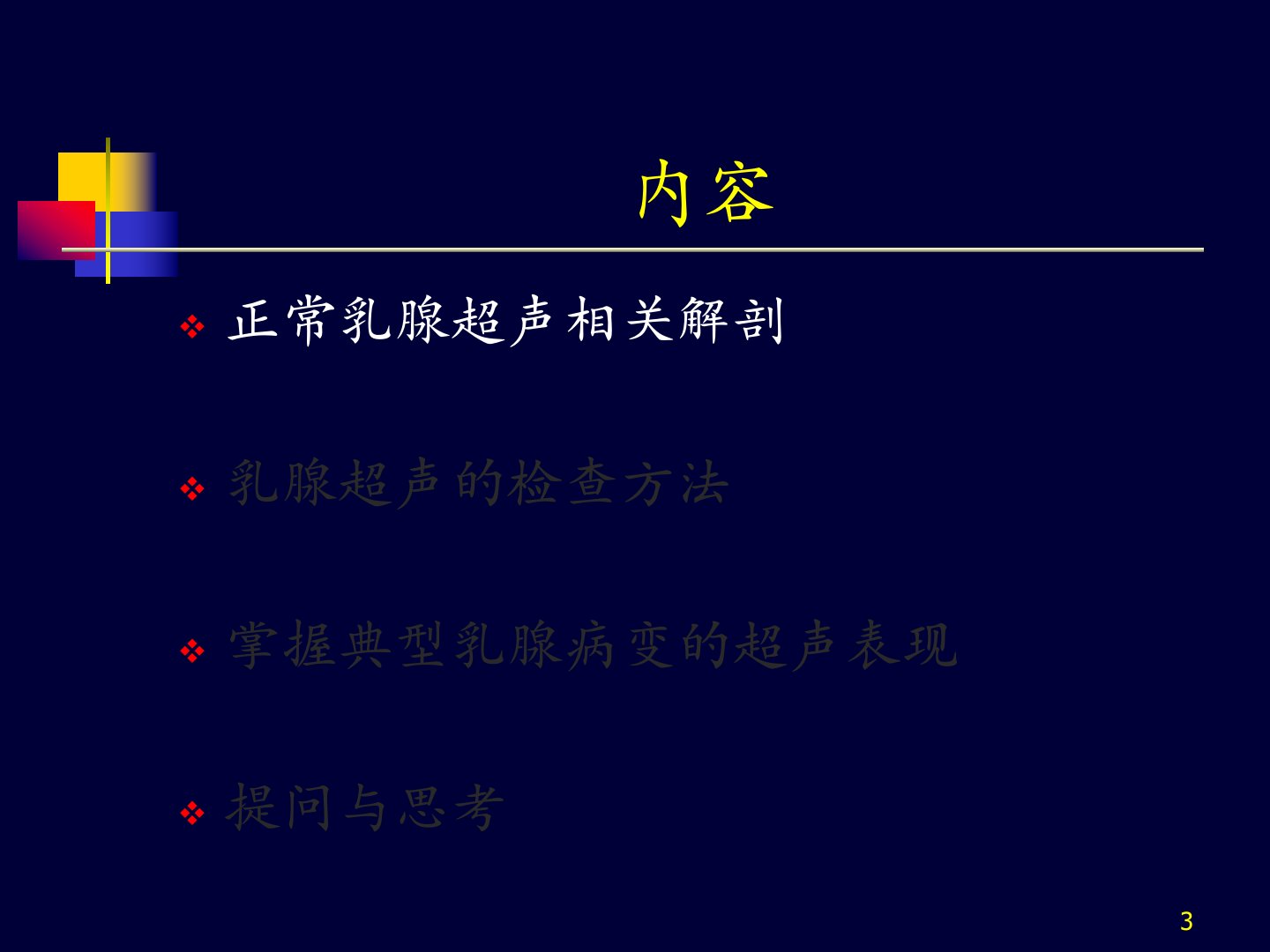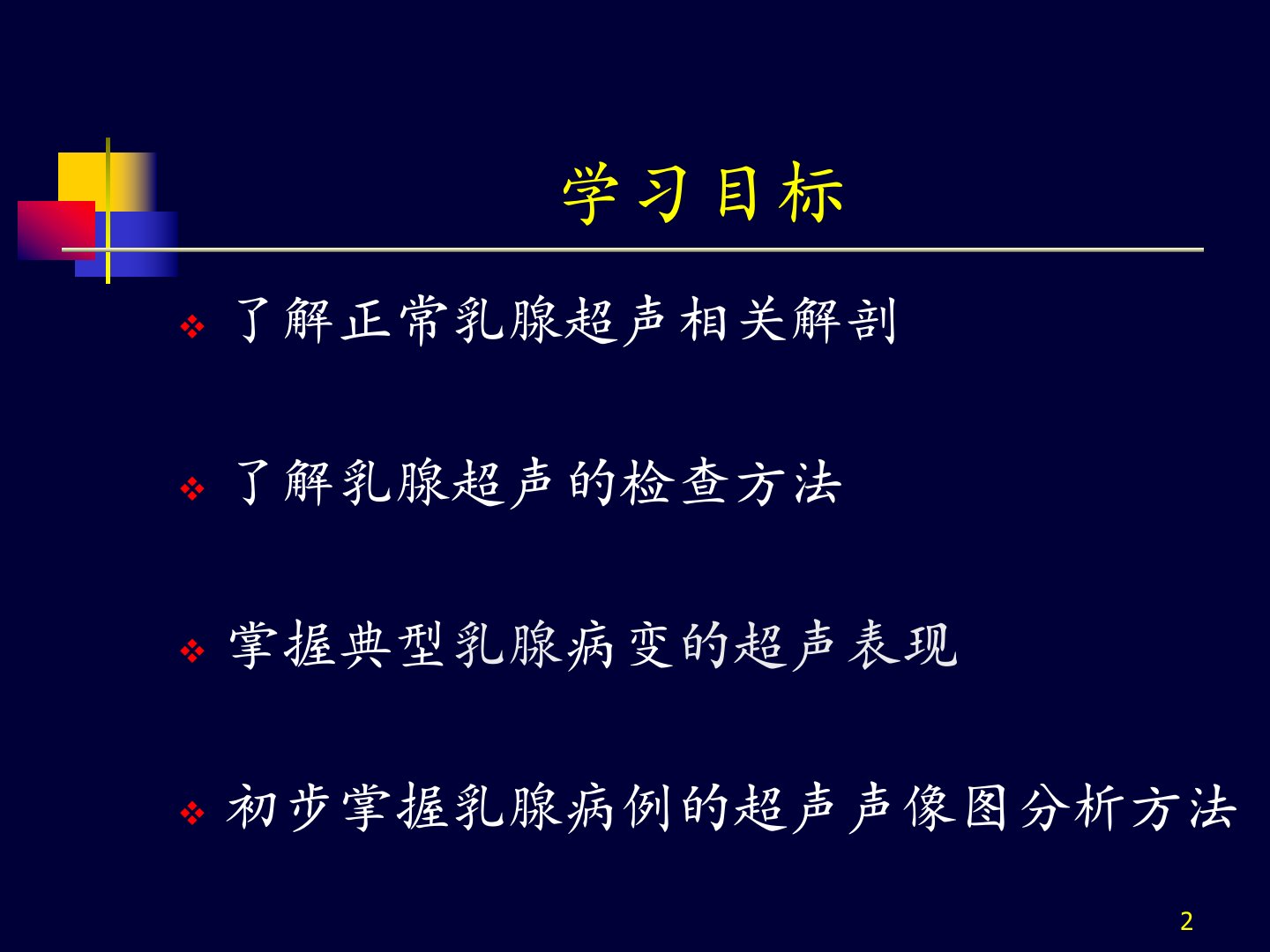 乳腺超声学习旨在了解正常乳腺超声解剖、检查方法掌握典型病变超声表现及声像图分析方法。内容涵盖正常乳腺超声解剖与组织学基础、检查方法包括全乳腺从上到下平行移动探头或以乳头为中心辐射状扫查以及对乳腺内病灶的纵切、横切和放射状切面检查。典型乳腺病变方面乳腺癌多为低回声形态不规则、边界不清、周边有毛刺或强回声晕可伴后方回声衰减、微小钙化肿瘤内血流信号增多且不规则弹性成像病灶多呈蓝色提示硬度高于正常组织;乳腺腺病超声表现多样可表现为腺体结构紊乱、合并实性结节或囊肿;乳腺纤维腺瘤肿块多呈圆形或分叶状边界清晰;导管内乳头状瘤乳晕下导管扩张内可见中强回声实性成份;急性乳腺炎炎性肿块低回声、边界不清脓肿形成时内部出现不均质无回声区。最后通过三个思考题展示了如何根据患者病史和超声图像特征进行诊断和鉴别诊断。