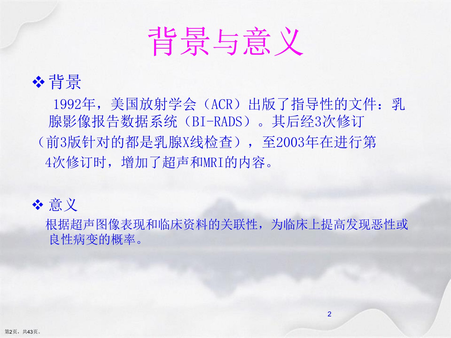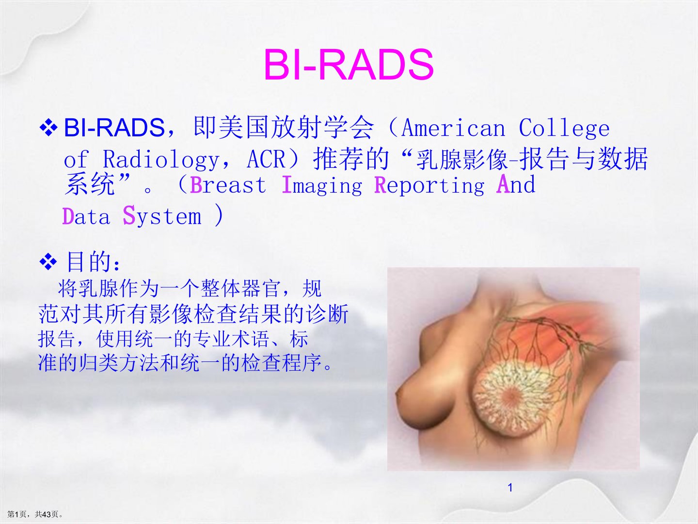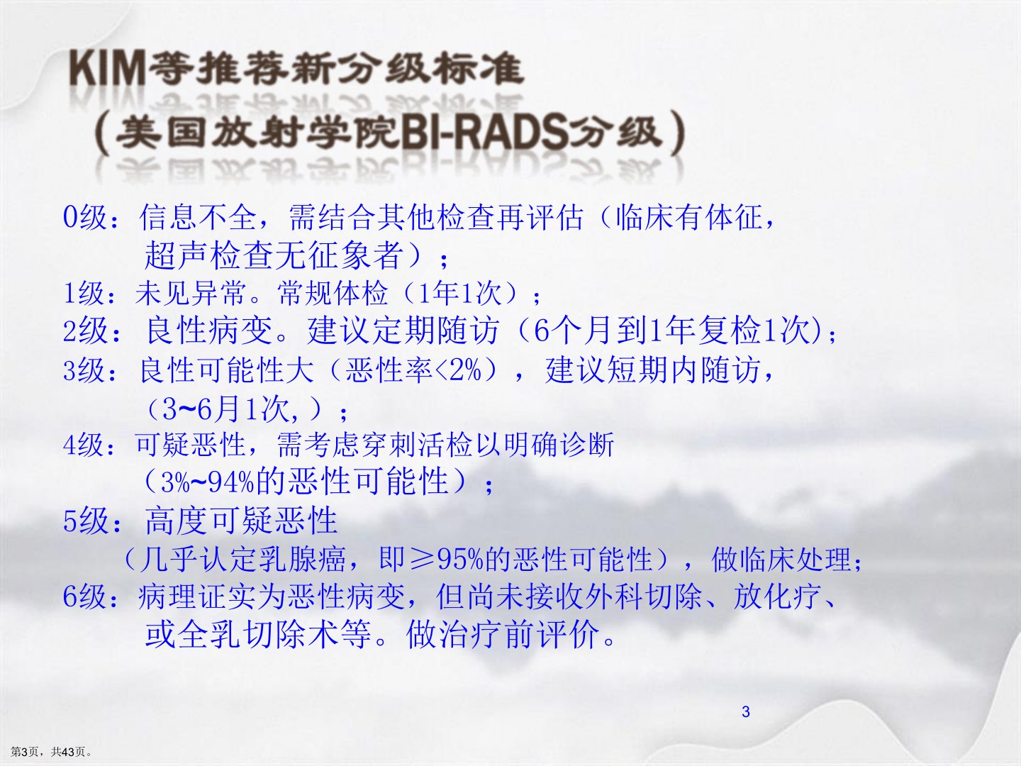 BIRADS即“乳腺影像报告与数据系统”由美国放射学会(ACR)推荐旨在统一乳腺影像检查的诊断报告标准包括术语、归类方法和检查程序。该系统自1992年首次发布后经历了多次修订2003年第4次修订时增加了超声和MRI内容有助于提高临床上发现乳腺恶性或良性病变的概率。BIRADS系统将乳腺病变分为06级:0级需结合其他检查;1级表示无异常;2级为良性病变;3级良性可能性大;4级性质待定恶性可能性394需穿刺活检可细分为4a、4b、4c;5级恶性可能性大于95;6级则用于活检证实为恶性但还未进行治疗的影像评估。判定参考标准主要依据肿块形态、边缘、内部回声等超声图像特征低度和高度恶性可疑特征分别对应不同BIRADS级别。