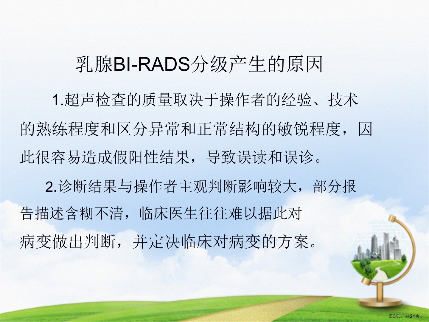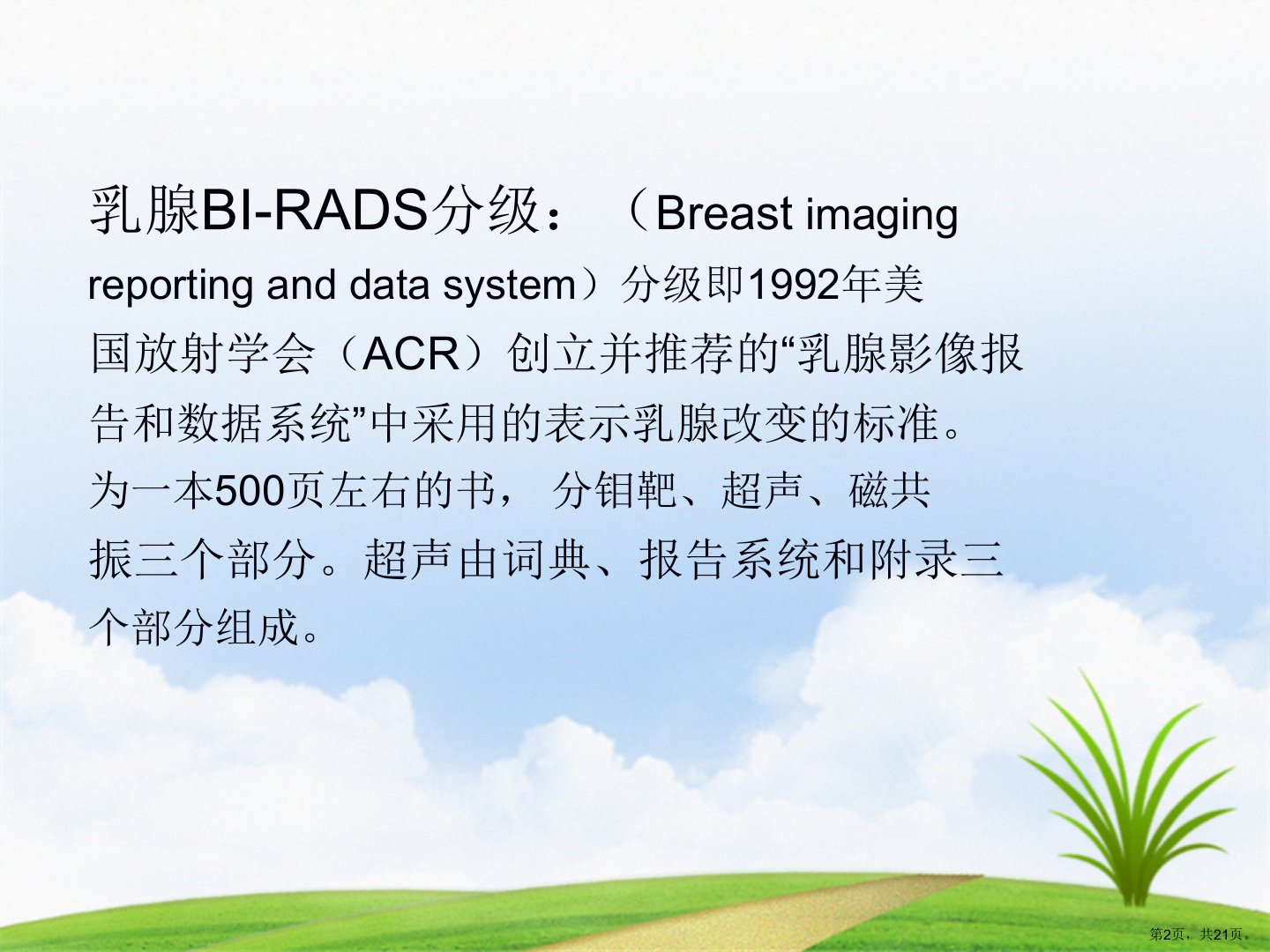 《乳腺超声BIRADS分级演示文稿》共21页介绍了乳腺BIRADS分级相关知识。该分级是1992年美国放射学会创立并推荐的“乳腺影像报告和数据系统”中表示乳腺改变的标准分钼靶、超声、磁共振三部分其中超声部分由词典、报告系统和附录组成。由于超声检查质量受操作者影响大易造成误诊且诊断结果主观性强因此产生了BIRADS分级其目的在于规范报告术语、方便结果对比、加强医务工作者沟通、利于医患理解病情及收集数据。分级共6类:0类需进一步检查;1类为阴性建议一年随诊;2类为良性病变半年至一年随诊;3类可能良性建议46月短期随访;4类可疑异常需病理检查且根据风险分为4a低度、4b中度、4c高度可疑;5类高度怀疑恶性可能性大于95建议临床治疗;6类已知为恶性用于描述已被活检证实为乳腺癌但先前仅进行了有限治疗的病例。