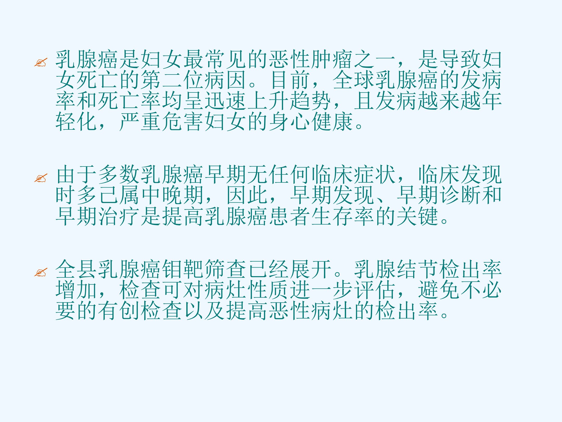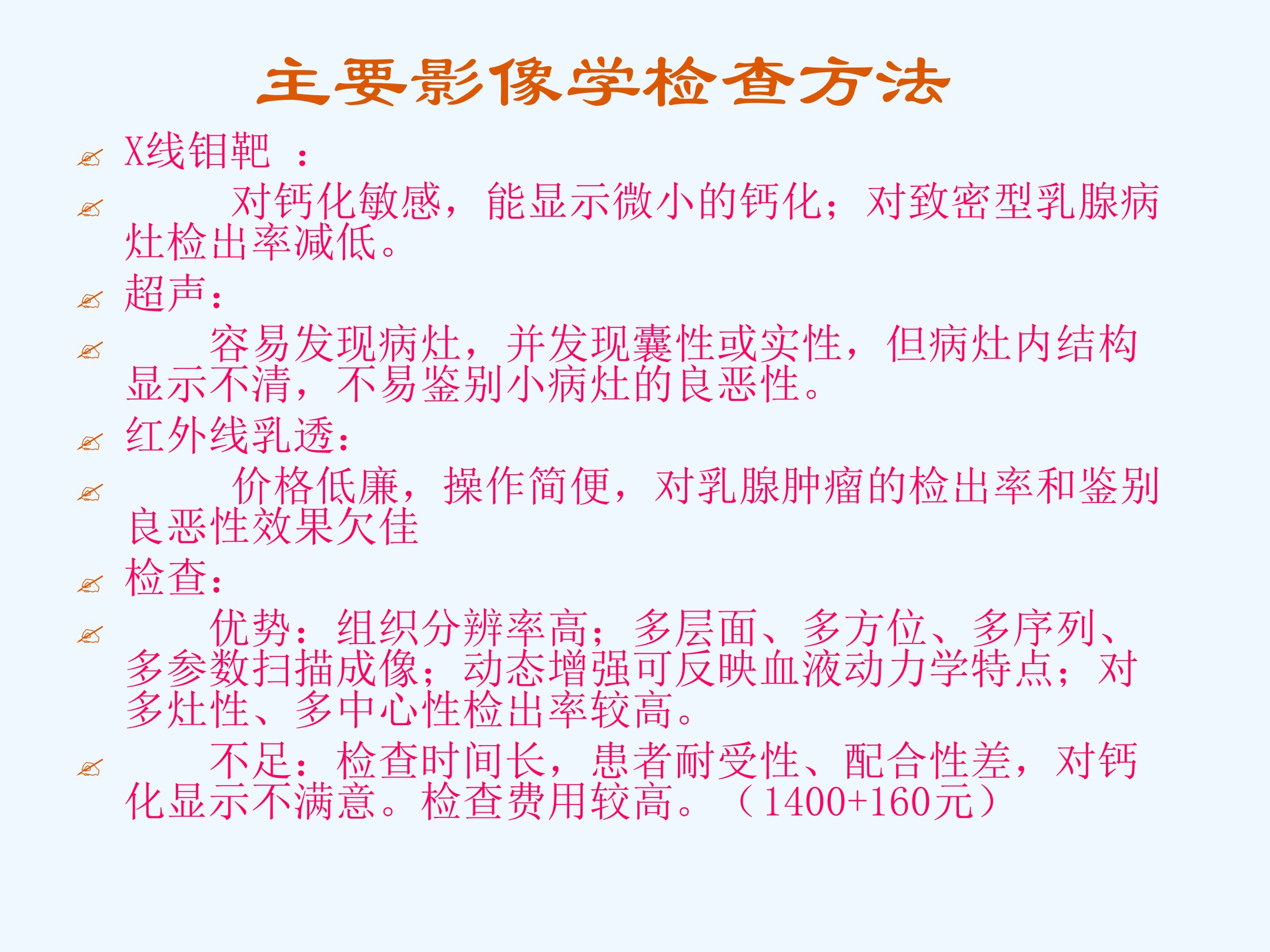 乳腺癌是妇女常见恶性肿瘤严重危害身心健康其发病率呈上升趋势且日趋年轻化。因多数乳腺癌早期无症状故早期发现、诊断和治疗是提高患者生存率的关键。目前乳腺癌筛查已展开可避免不必要的有创检查提高恶性病灶检出率。主要影像学检查方法中X线钼靶对钙化敏感但对致密型乳腺病灶检出率低;超声易发现病灶但不易鉴别小病灶的良恶性;红外线乳透价格低廉但检出率和鉴别效果欠佳。磁共振检查组织分辨率高可多层面、多方位成像动态增强反映血液动力学特点但检查时间长、费用高。乳腺增生病多见于3050岁女性乳腺纤维腺瘤多发生于40岁以下女性磁共振可准确评估。乳腺癌好发于4060岁女性磁共振增强检查可鉴别病变良恶性。随着磁共振进入3T时代可对乳腺结节进行更为准确的评估。