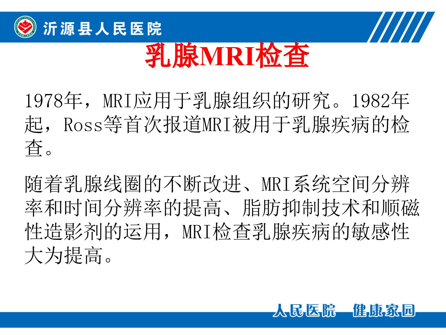 磁共振室201812乳腺病变磁共振应用摘要1978年MRI开始用于乳腺组织研究1982年首次用于乳腺疾病检查。随着乳腺线圈改进及技术提升MRI检查乳腺疾病的敏感性大幅提高。我院2018年5月至今累计开展22例MRI检查使用西门子15T磁共振系统及专用乳腺线圈。乳腺影像学检查方法多样X线摄影为首选但存在盲区;乳腺导管造影适用于乳头溢液患者;超声检查可多角度扫查但对深层组织及细微钙化辨识能力有限;CT检查作为钼靶摄影补充。MRI检查最佳时间为月经后714天应用动态增强及减影技术可清晰显示乳腺各层次结构。乳腺MRI应用指征包括首选检查(如乳腺癌易感人群普查、乳腺癌患者对侧乳腺随访等)和二线检查(如良恶性鉴别诊断、新辅助化疗监测等)。MRI在乳腺癌检出、诊断与鉴别诊断、局部分期及疗效监测方面优势明显尤其在高风险人群中敏感度高虽假阳性率较高但利大于弊。不过该技术对钙化不敏感、检查时间长、费用高。