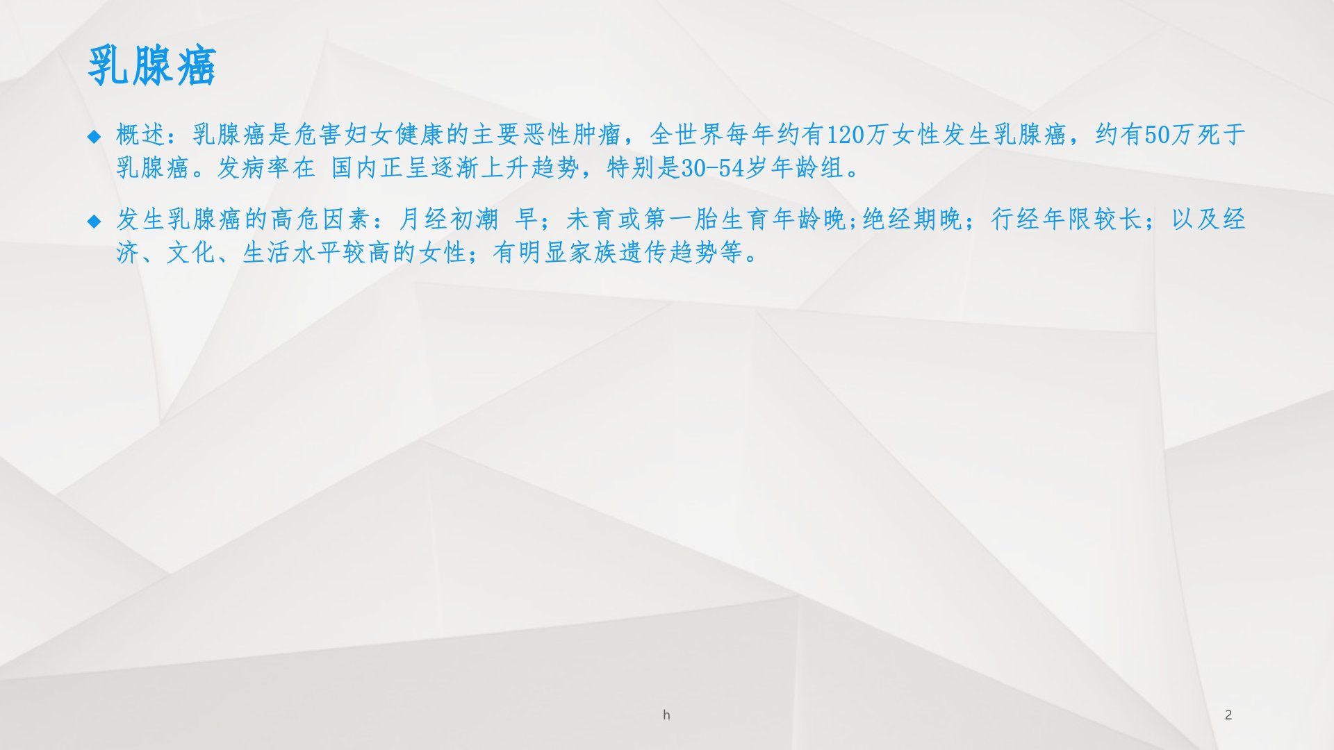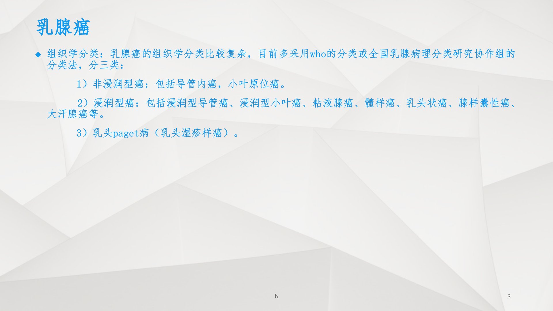 h乳腺癌的x线诊断摘要乳腺癌是危害妇女健康的主要恶性肿瘤发病率在国内呈上升趋势。其高危因素包括初潮早、未育或晚育、绝经晚、行经年限长、经济文化水平高及家族遗传等。组织学上乳腺癌分为非浸润型癌、浸润型癌和乳头Paget病三类。临床表现上乳腺癌以无痛性肿块为主呈圆形或不规则形质地硬边界不清。乳头异常、炎性表现、皮肤改变(如酒窝征、橘皮样变)及其他征象(如疼痛、乳头溢液、转移症状)也较为常见。影像学上乳腺癌的主要X线征象包括致密肿块影(最常见形态多样边缘多为毛刺状)、局限性致密浸润影、恶性钙化(线状、泥沙样、团簇样)及毛刺。次要征象有皮肤增厚、乳头内陷、导管征、彗星征、局部血运增加等。特殊类型如炎性乳癌和派杰氏病也有特定X线表现。乳腺良恶性肿瘤的鉴别中边界是重要指征。