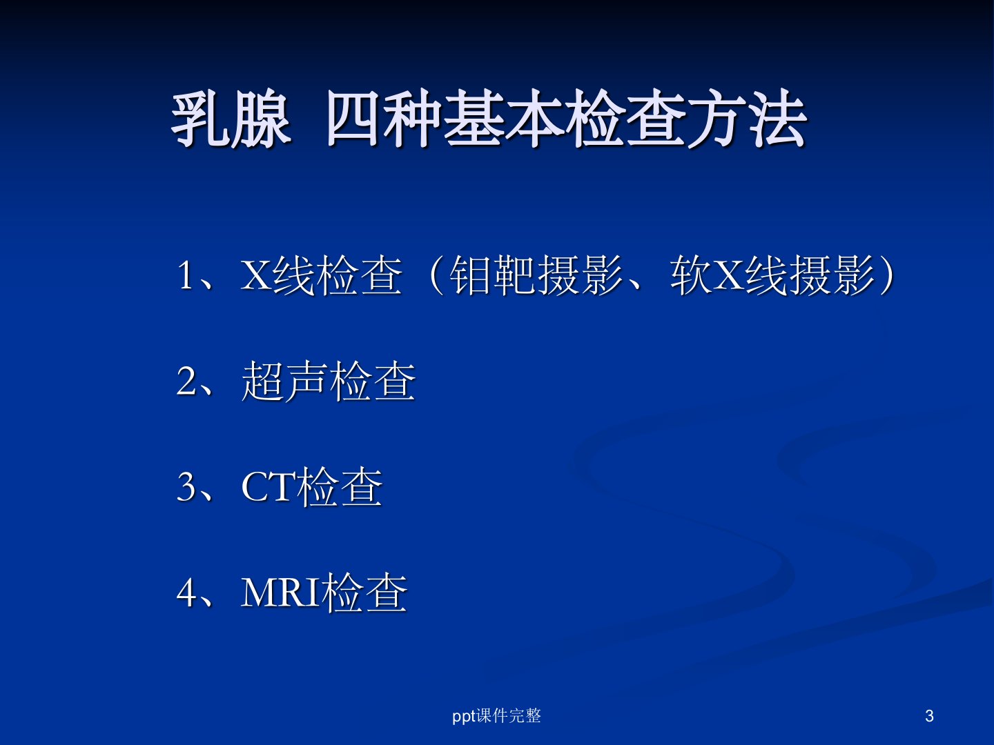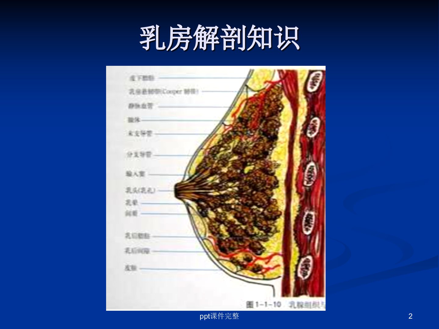 第六章乳腺ppt课件完整乳房解剖知识ppt课件完整乳腺四种基本检查方法1、X线检查(钼靶摄影、软X线摄影)2、超声检查3、CT检查4、MRI检查ppt课件完整钼靶X线机ppt课件完整1、X线检查轴位侧斜位ppt课件完整正常x线(图)脂肪型乳腺致密型乳腺ppt课件完整第一节一、正常X线表现(1)1.乳头及乳晕:乳晕区皮肤厚度为1mm~5mm2.皮肤及皮下脂肪层:3.腺体组织:片状影,随年龄增长及是否生育而不同ppt课件完整第一节三、正常CT表现(1)1.脂肪组织:CT值-80HU~-110HU,乳后脂肪间隙的显示优于平片2.腺体组织:CT值10HU~30HU,片状致密影,其内散在大小及多少不等的...