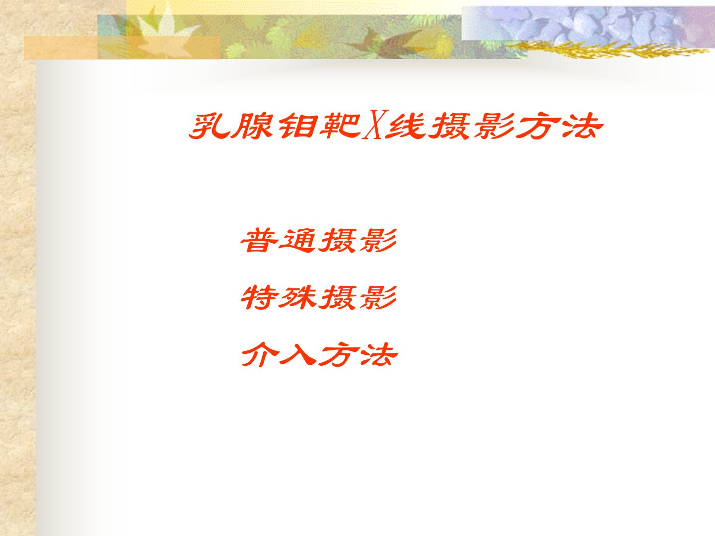 乳腺摄影的临床应用摘要乳腺摄影在临床应用广泛方法多样。普通摄影含轴位、斜位等;特殊摄影有局部点压摄影、局部点压放大摄影适用于致密型乳腺、可疑结节及细小钙化灶等情况。介入方法中X线导引细针抽吸活检用于评定乳腺病变包括微小病变术前定位;X线导引下导丝定位通过特定步骤对微小病变定位便于术中观察。乳腺导管造影可显示乳腺导管内病变。乳腺X线摄影适应症包括30岁以上有乳腺问题妇女等禁忌症有装心脏起博器病人、妊娠哺乳期妇女等。正常乳腺X线表现随年龄和生理状态变化。乳腺癌直接征象有肿块、钙化间接征象含密度增高、结构紊乱等X线诊断分型有肿块型等多种。纤维腺瘤、脂肪瘤、错构瘤、乳腺导管内乳头状瘤等良性肿瘤各有X线表现特征。乳腺疾病X线鉴别诊断需综合病灶大小、形态、边界、密度、钙化灶等因素。