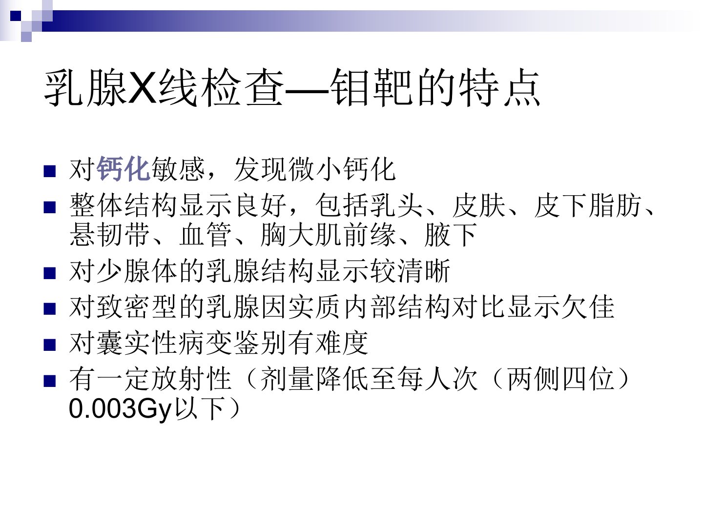 乳腺X线检查—钼靶对钙化敏感能发现微小钙化整体结构显示良好但对致密型乳腺实质内部结构对比显示欠佳对囊实性病变鉴别有难度且有一定放射性。适用范围包括40岁以上妇女及40岁以下有乳腺癌高危因素或体检异常者。相对禁忌症有乳房假体植入者、乳房肿块感染化脓或溃烂者、妊娠期妇女。常规投照体位为轴位和斜位。乳腺X线诊断包括肿块(边缘、形态、密度)和钙化(形态、分布)特征以及合并征象如皮肤凹陷等。乳腺良恶性肿块、钙化可通过X线鉴别。乳腺X线评估采用BIRADS分类法0级需进一步影像评价IIII级倾向良性IV级可疑异常需考虑活检V级高度怀疑恶性VI级已证实恶性。小结强调了乳腺钼靶检查的体位、诊断规范及BIRADS评估分类的重要性。