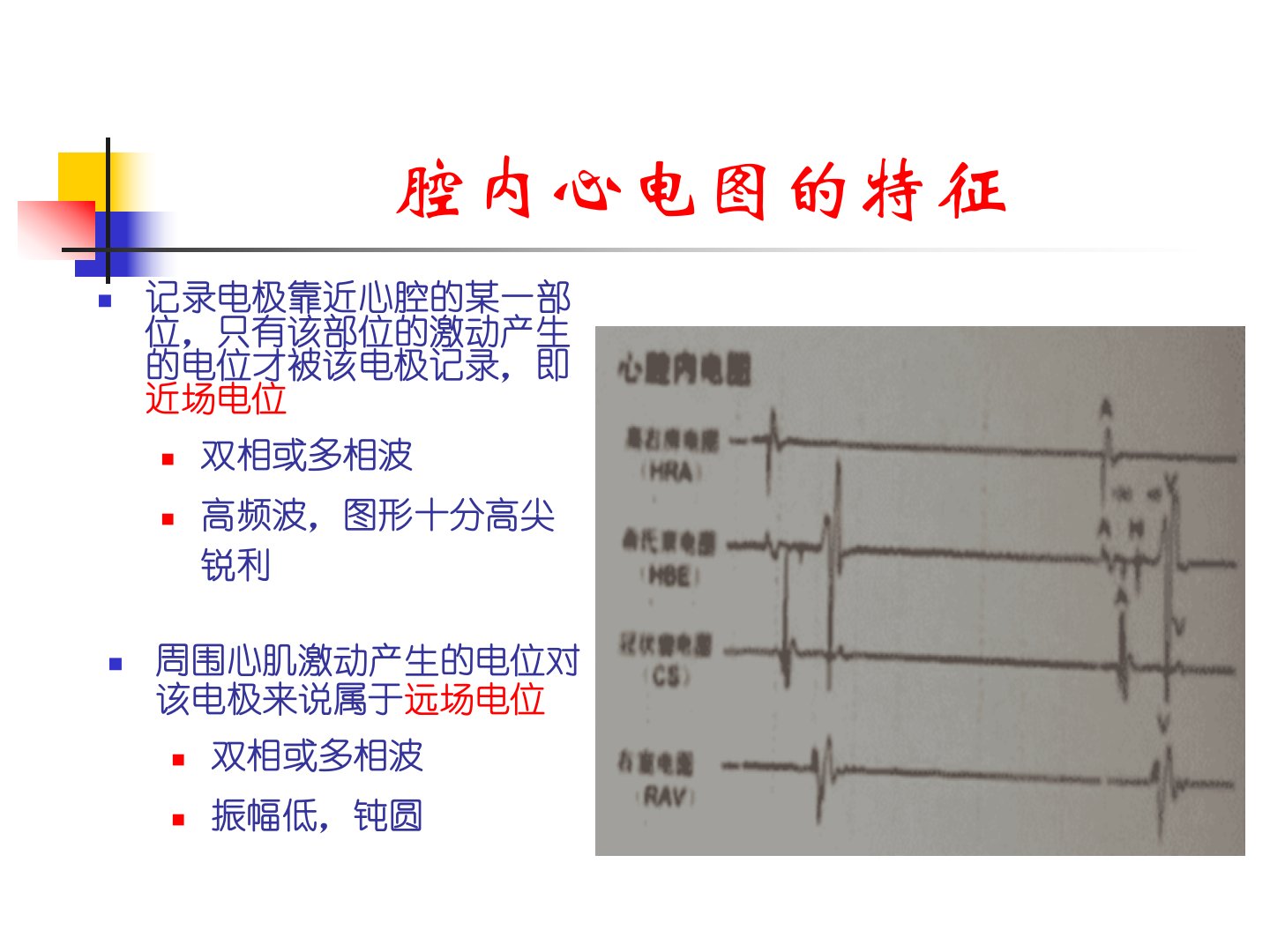腔内心电图是通过将记录电极导管置于心腔内记录的心脏电活动即心腔内电图(IEGM)。其特征包括近场电位和远场电位前者由记录电极附近的心肌激动产生图形高尖锐利后者由周围心肌激动产生振幅低钝圆。由于腔内电图难以区分心房波和心室波需结合体表心电图分析。记录时电极导管经静脉穿刺在X线引导下放置到HRA、RV、HBE等记录部位纸速常用100400mms。腔内心电图可分为心房电图、希氏束电图、冠状窦电图、心室电图等。其中希氏束电图可记录到希氏束电位H波、心房电位A波和心室电位V波特征为快速双向波或三相波AH间期代表右房下部到希氏束的传导时间正常值为60130msHV间期代表希氏束近端到心室肌的传导时间正常值为3555ms。冠状窦电图可记录到心房电位和心室电位提供左房、左室的激动顺序标志。
