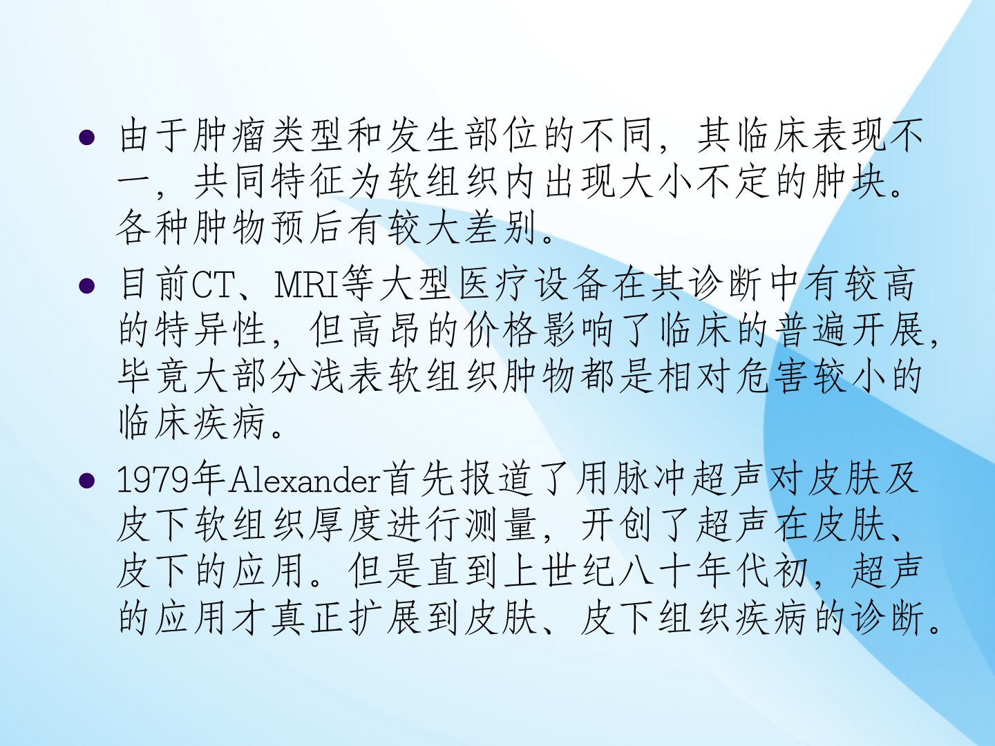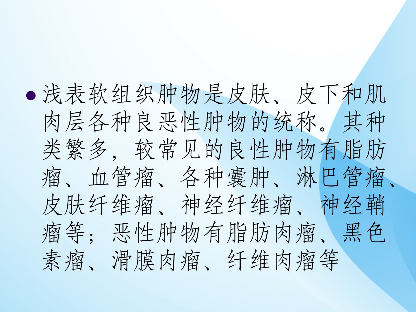 浅表肿物的超声诊断思路摘要浅表软组织肿物涵盖皮肤、皮下和肌肉层多种良恶性肿物良性如脂肪瘤、血管瘤等恶性如脂肪肉瘤、黑色素瘤等。其临床表现因肿瘤类型和发生部位而异预后差别大。目前CT、MRI等大型医疗设备在诊断中有较高特异性但价格高昂限制了其临床普遍开展。1979年脉冲超声开创了超声在皮肤、皮下的应用八十年代初扩展到皮肤、皮下组织疾病的诊断。超声检查浅表软组织肿物敏感性高但特异性较差不过随着超声技术发展其特异性不断提高且超声有着方便、实时、动态、可重复性强、价格低等特点应用日趋广泛。诊断时首先要问清病史、简单查体明确病情发展等情况。超声检查要根据肿物大小、范围选合适探头扫查注意手法力度。浅表肿物可分为假性肿物和真性肿物真性肿物又可分为脂肪源性、神经源性等。文章还介绍了常见软组织肿物如脂肪瘤、脂肪肉瘤、血管瘤、皮肤囊肿、神经纤维瘤、神经鞘瘤、滑膜肉瘤、皮肤纤维瘤、横纹肌肉瘤的特点及声像图表现。