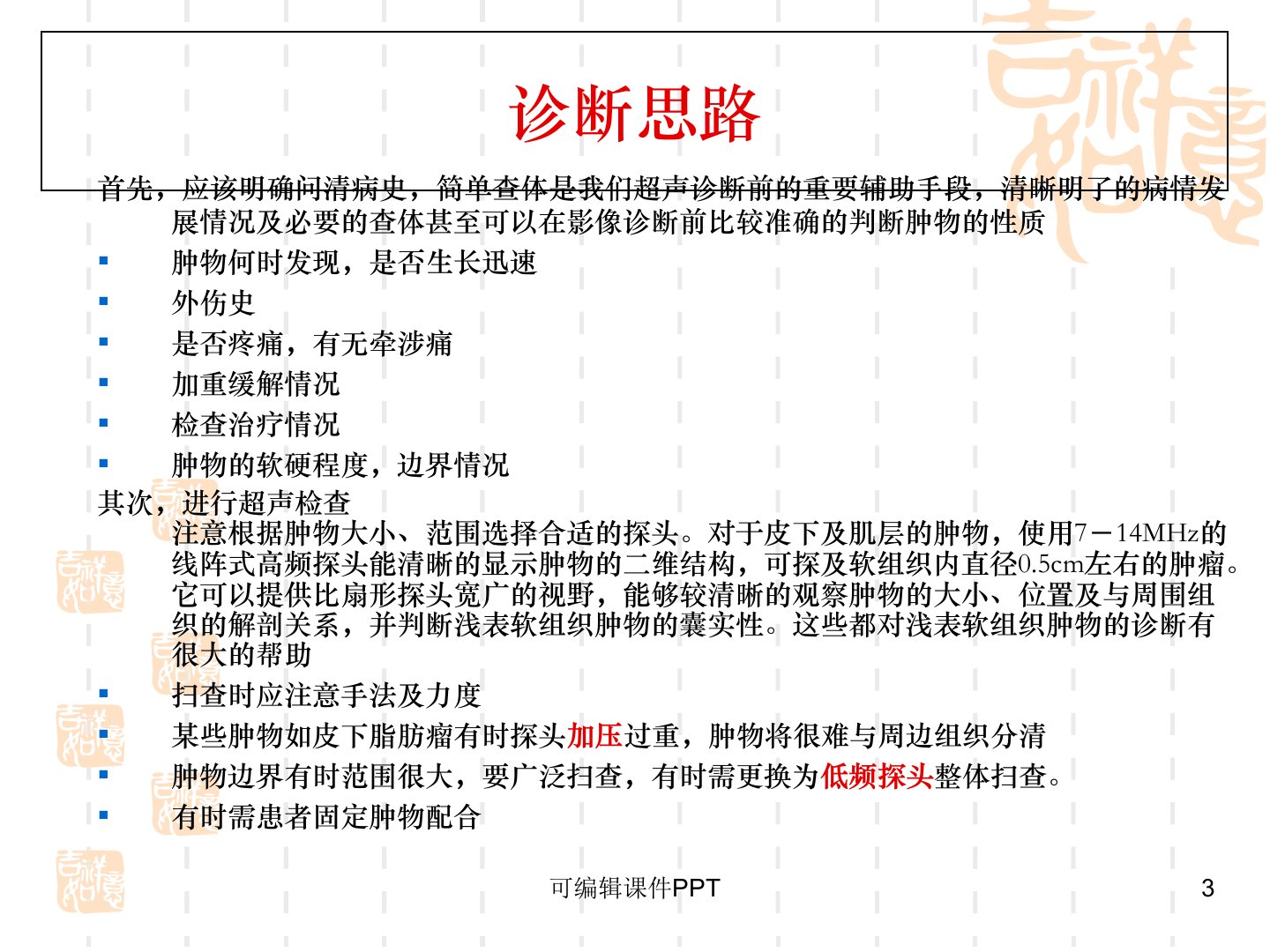 浅表肿物的超声诊断思路摘要浅表软组织肿物涵盖皮肤、皮下和肌肉层的良恶性肿物种类繁多。良性常见有脂肪瘤、血管瘤等恶性有脂肪肉瘤、黑色素瘤等。不同肿瘤临床表现有差异预后也不同。CT、MRI诊断特异性高但价格昂贵而超声检查敏感性高特异性虽曾较差但随着高分辨率高频探头及彩色、脉冲多普勒等新技术应用特异性不断提高。且超声方便、实时、可重复性强、价格低应用日趋广泛。皮肤是人体最大器官不同部位厚度不同分为表皮层、真皮层及皮下组织层。诊断时先明确病史、简单查体再超声检查根据肿物大小选合适探头扫查注意手法力度。超声图像诊断观可判断肿物层次、囊实性等。常见浅表肿物可分为假性肿物和真性肿物真性肿物又可分为脂肪源性、神经源性、纤维源性、肌组织肿瘤、血管源性、滑膜源性等多种类型。不同类型肿物声像图表现不同如脂肪瘤多呈椭圆形或分叶状回声均匀;脂肪肉瘤轮廓较清晰无包膜内呈均匀性低回声;血管瘤通常为含有小腔的混和结构等。