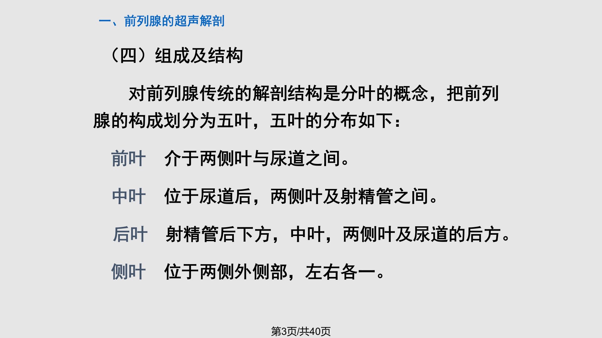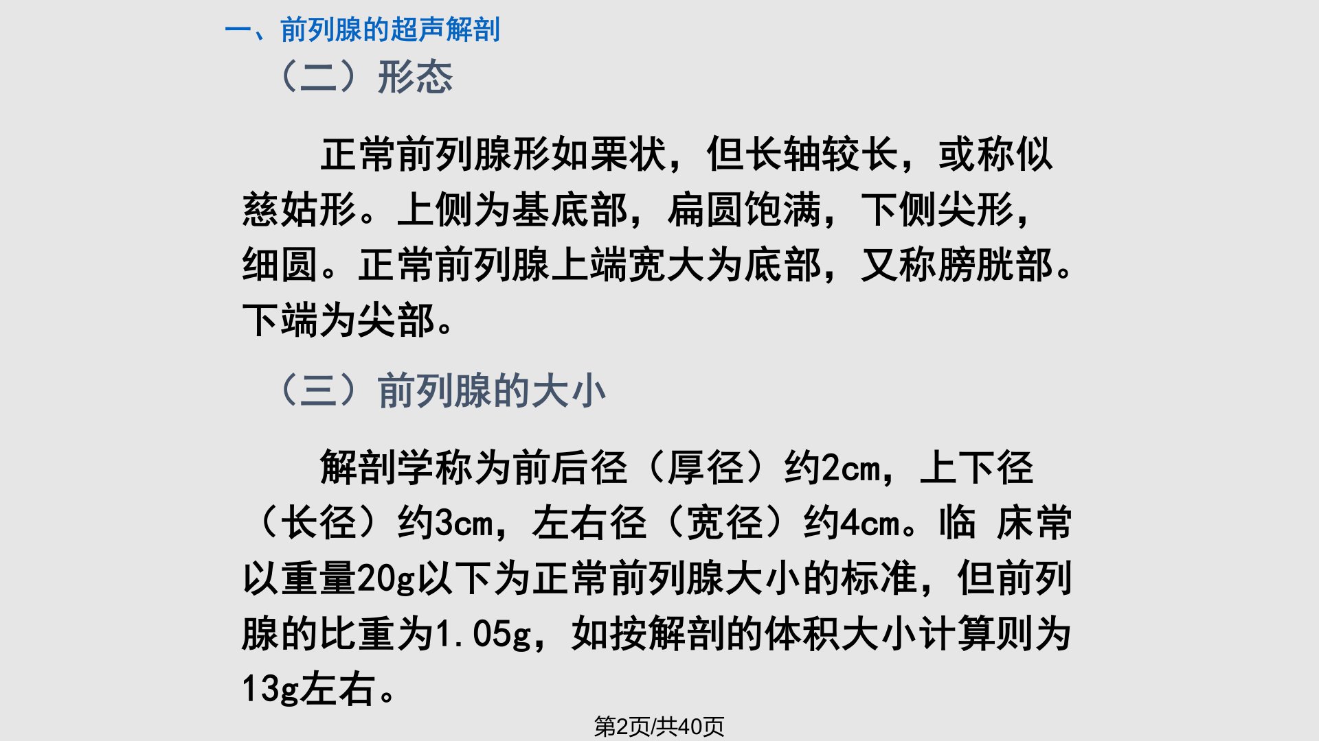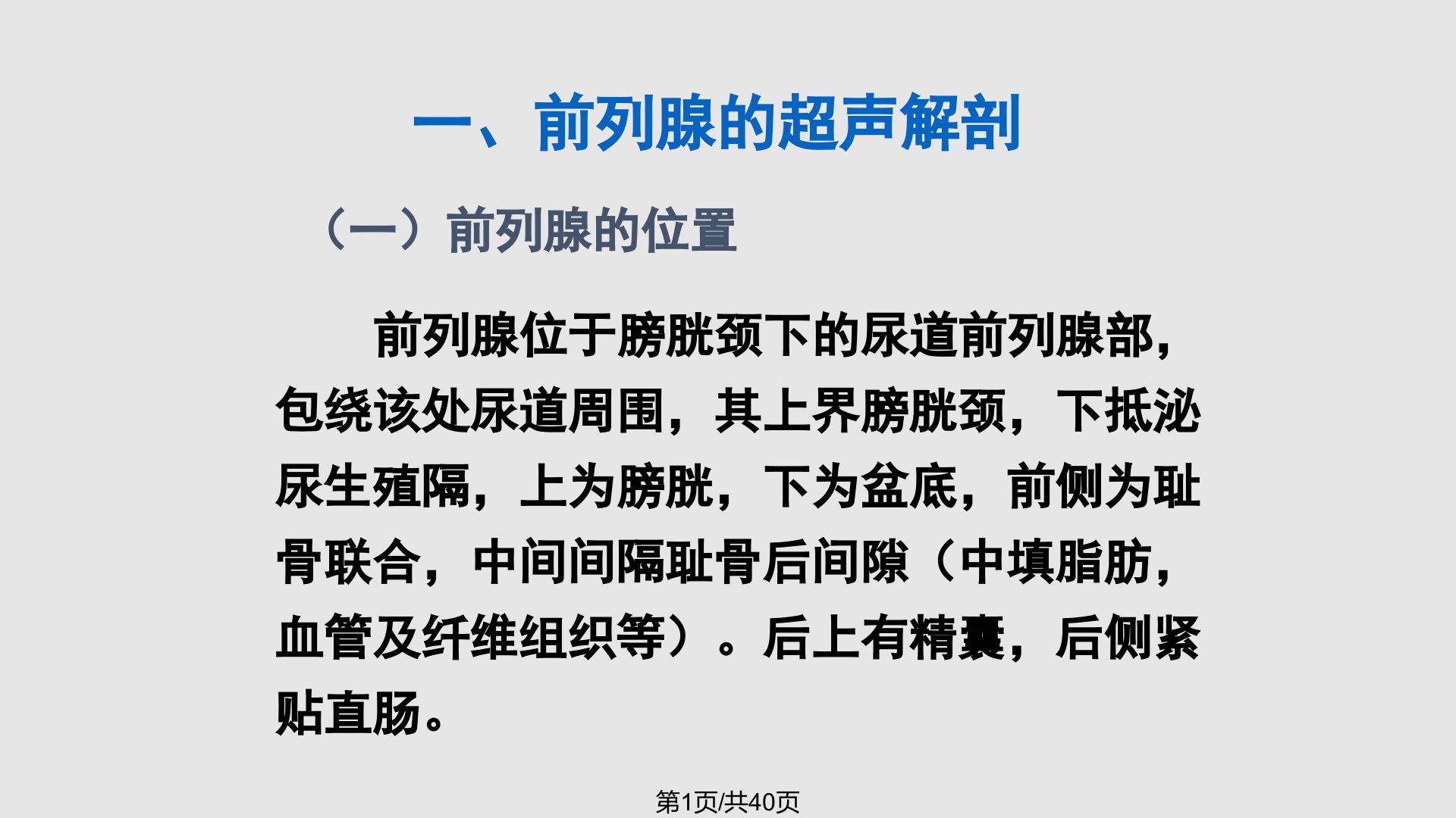 一、前列腺的超声解剖(一)前列腺的位置前列腺位于膀胱颈下的尿道前列腺部,包绕该处尿道周围,其上界膀胱颈,下抵泌尿生殖隔,上为膀胱,下为盆底,前侧为耻骨联合,中间间隔耻骨后间隙(中填脂肪,血管及纤维组织等)。后上有精囊,后侧紧贴直肠。第1页/共40页(二)形态正常前列腺形如栗状,但长轴较长,或称似慈姑形。上侧为基底部,扁圆饱满,下侧尖形,细圆。正常前列腺上端宽大为底部,又称膀胱部。下端为尖部。(三)前列腺的大小解剖学称为前后径(厚径)约2cm,上下径(长径)约3cm,左右径(宽径)约4cm。临床常以重量20g以下为正常前列腺大小的标准,但前列腺的比重为1.05g,如按解剖的体积大小计算则为13g...