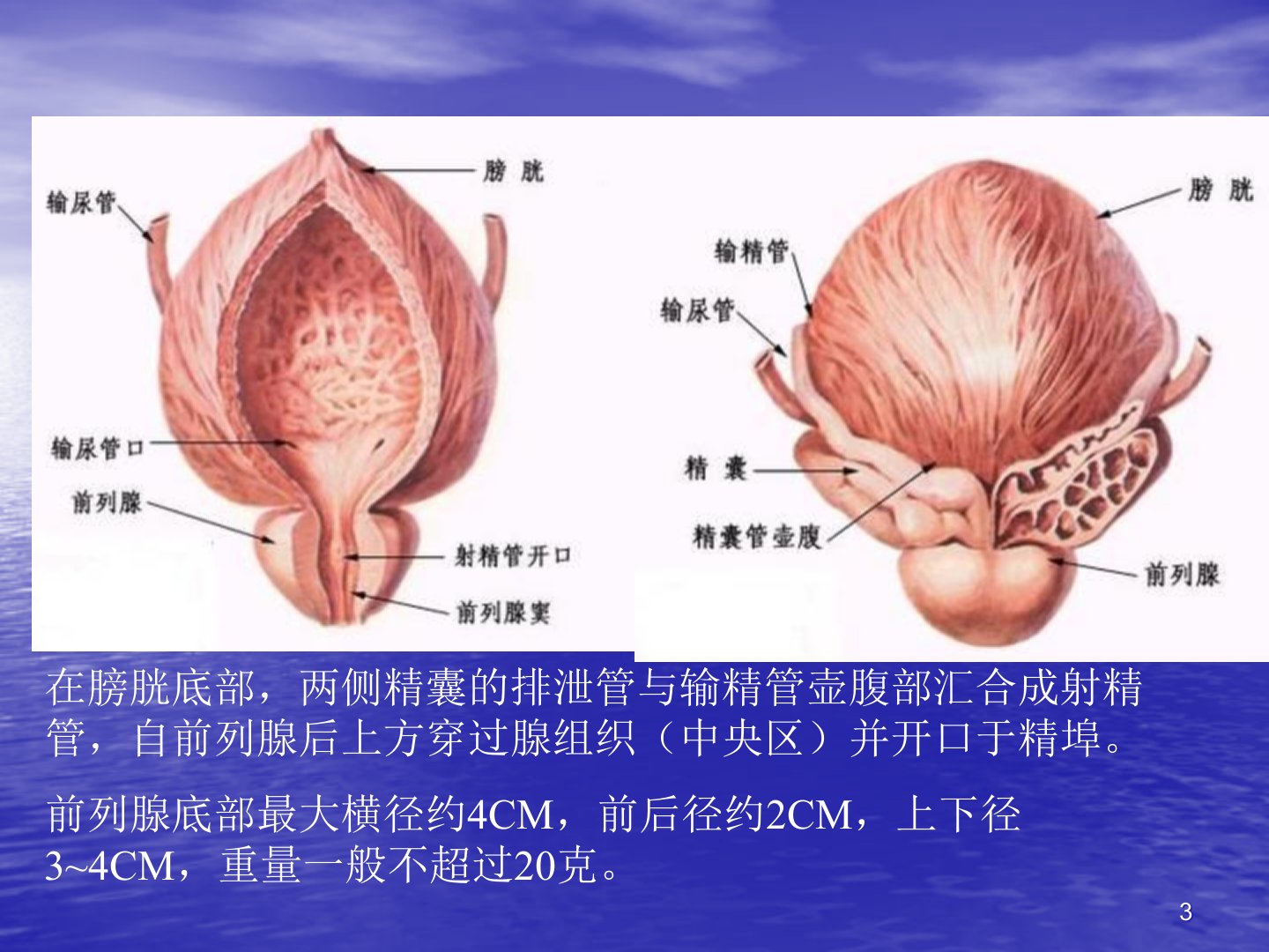 前列腺超声诊断超声诊断科TheUltrasonicDiagnosisOfProstate一、前列腺的超声解剖(一)大体解剖(如图)前列腺位于耻骨联合后,直肠前,尿生殖隔以上。前面窄而钝圆;后面比较宽阔平坦。位于膀胱下方并围绕尿道的起始部。在膀胱底部,两侧精囊的排泄管与输精管壶腹部汇合成射精管,自前列腺后上方穿过腺组织(中央区)并开口于精埠。前列腺底部最大横径约4CM,前后径约2CM,上下径3~4CM,重量一般不超过20克。(二)前列腺的内部结构前列腺按照不同角度有以下几个分区观点:1、按照与尿道的关系分区2、从组织学角度划分3、带区解剖新概念1、按照与尿道的关系分区前叶:很小,位于尿道之前和两...