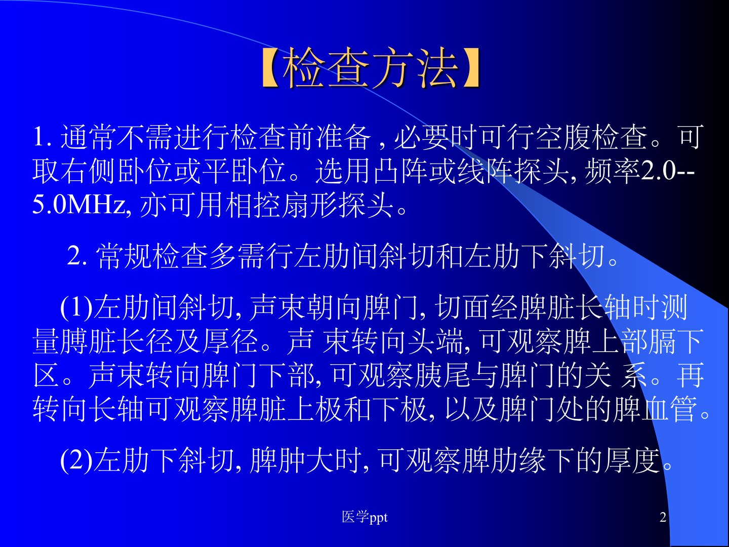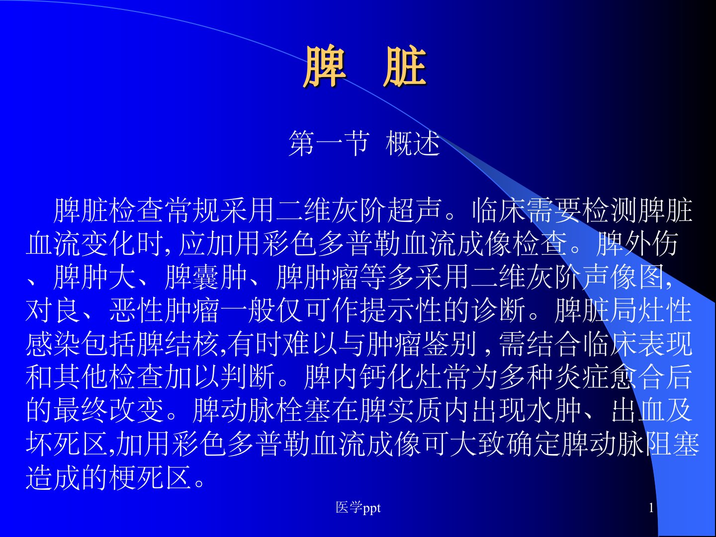 第一节概述脾脏检查常规采用二维灰阶超声。临床需要检测脾脏血流变化时,应加用彩色多普勒血流成像检查。脾外伤、脾肿大、脾囊肿、脾肿瘤等多采用二维灰阶声像图,对良、恶性肿瘤一般仅可作提示性的诊断。脾脏局灶性感染包括脾结核,有时难以与肿瘤鉴别,需结合临床表现和其他检查加以判断。脾内钙化灶常为多种炎症愈合后的最终改变。脾动脉栓塞在脾实质内出现水肿、出血及坏死区,加用彩色多普勒血流成像可大致确定脾动脉阻塞造成的梗死区。脾脏医学ppt1.通常不需进行检查前准备,必要时可行空腹检查。可取右侧卧位或平卧位。选用凸阵或线阵探头,频率2.0--5.0MHz,亦可用相控扇形探头。2.常规检查多需行左肋间斜切和左肋下...