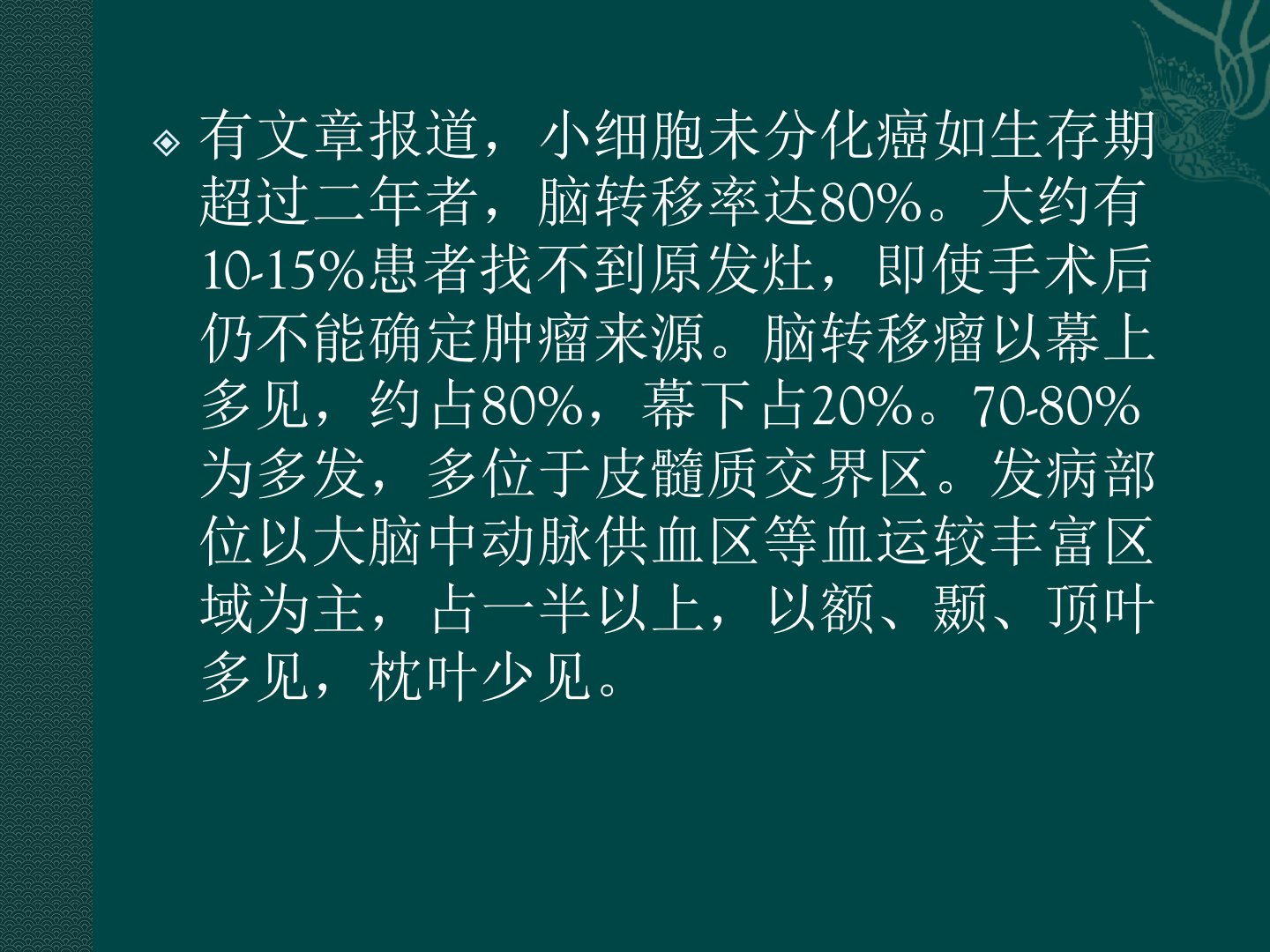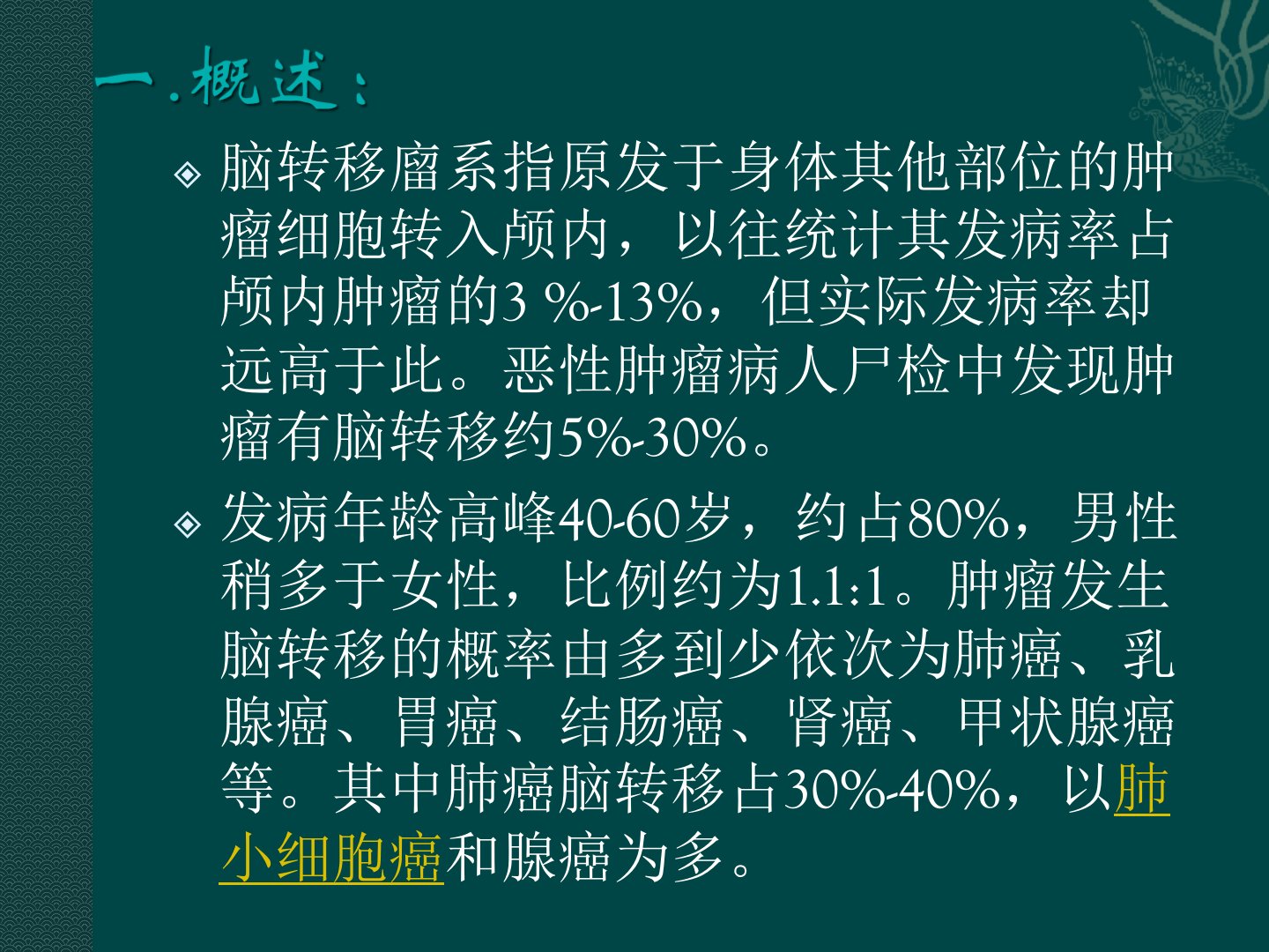 脑转移瘤影像科摘要脑转移瘤指原发于身体其他部位的肿瘤细胞转入颅内实际发病率高于统计恶性肿瘤病人尸检中约53有脑转移。发病年龄高峰4060岁男性稍多于女性。肺癌脑转移占比最高约3040。约1015患者找不到原发灶。脑转移瘤以幕上多见7080为多发多位于皮髓质交界区。大多数患者有中枢神经系统功能紊乱症状起病后病情呈进行性加重。大体观上肿瘤与正常脑组织分界清楚中心常坏死、囊变和出血。转移途径以血行最多见。病理上脑转移瘤分为转移结节、病理软脑膜癌病、脑炎性型转移三种。CT检查显示转移瘤大多位于皮层或皮层下多为圆形或类圆形7080的病例多发。MRI检查显示典型转移瘤T1WI为低信号T2WI为高信号周边有水肿带。脑转移瘤需与脑膜炎、胶质瘤等鉴别磁共振波谱对鉴别诊断有帮助。