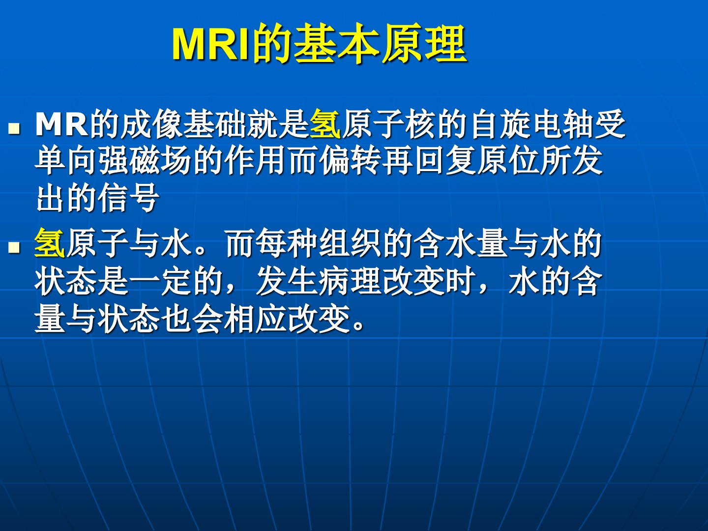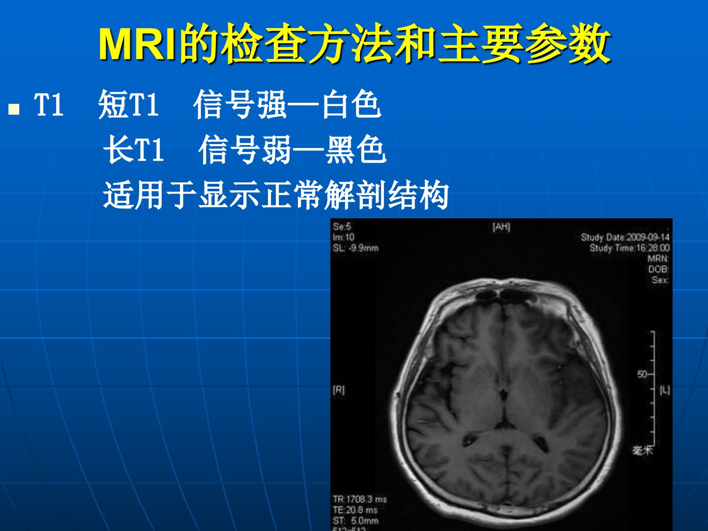 脑磁共振呈像MRI摘要脑磁共振呈像(MRI)基于氢原子核自旋电轴在强磁场下的偏转与回复信号。不同组织含水量与状态不同病理改变时其也会相应变化。检查方法上T1短时信号强为白色长时信号弱为黑色利于显示解剖结构;T2则相反利于观察病灶。Flair压水像可评价与脑脊液相邻脑组织DWI用于早期诊断细胞毒性水肿。增强MRI通过GdDTPA静脉给药可确切显示病变范围。磁共振血管呈像(MRA)无创且无需造影剂但TOF技术对血流信号依赖大。脑MRI中脑脊液、脂肪、骨皮质等组织信号各异。MRI可清晰显示水肿、梗死、囊肿、肿瘤等病变信号。不足之处在于对新鲜出血、铁钙骨结构显示欠佳。此外MRS可应用于观察脑内代谢物还介绍了分水岭梗死、后循环缺血等病症的MRI表现及中枢神经系统白血病、淋巴瘤等相关病症特点。