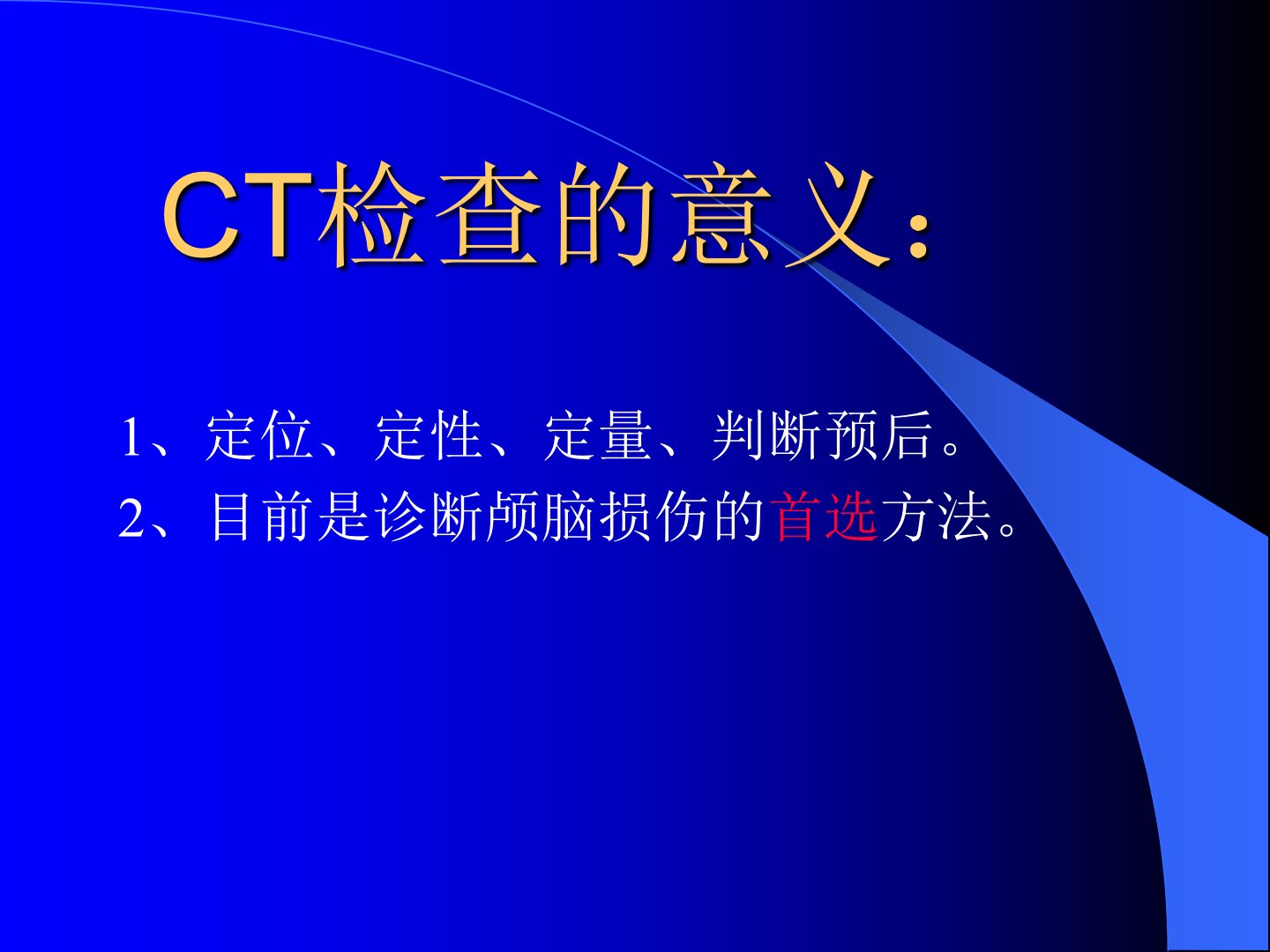 颅脑损伤的CT诊断摘要CT检查是诊断颅脑损伤首选方法其意义在于定位、定性、定量并判断预后。CT较MR具有检查时间短、能快速发现急性或超急性出血、医患易接近、检查费用低、便于血肿定位抽吸等优点。检查方法包括平扫、平扫增强及二、三维成像检查时需注意扫描全面、多窗观察测量CT值、合理选用切面。颅脑损伤按发病时间分为原发性和继发性损伤按病期分急性、亚急性、慢性按受累范围分单纯性、复合性按部位分头皮、颅骨、颅内等损伤。头皮损伤含头皮血肿等颅骨骨折分闭合型、开放型等颅底骨折有直接和间接征象。颅内血肿包括硬膜外、硬膜下血肿等各有不同特点及CT表现。蛛网膜下腔出血、脑室内出血、颅内积气等也有各自病因、部位及CT特征。脑挫伤血肿、脑穿通伤、脑白质剪切伤、脑干损伤、脑肿胀和脑水肿等也有不同病理、分类及CT表现。脑疝、脑积水也有相应定义和分类。