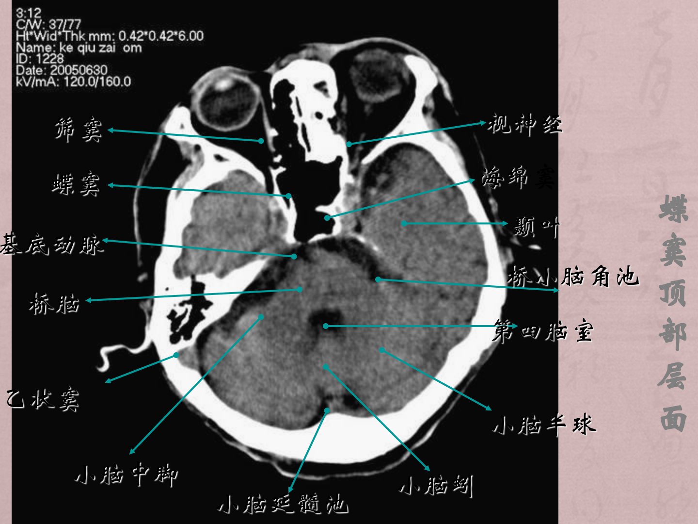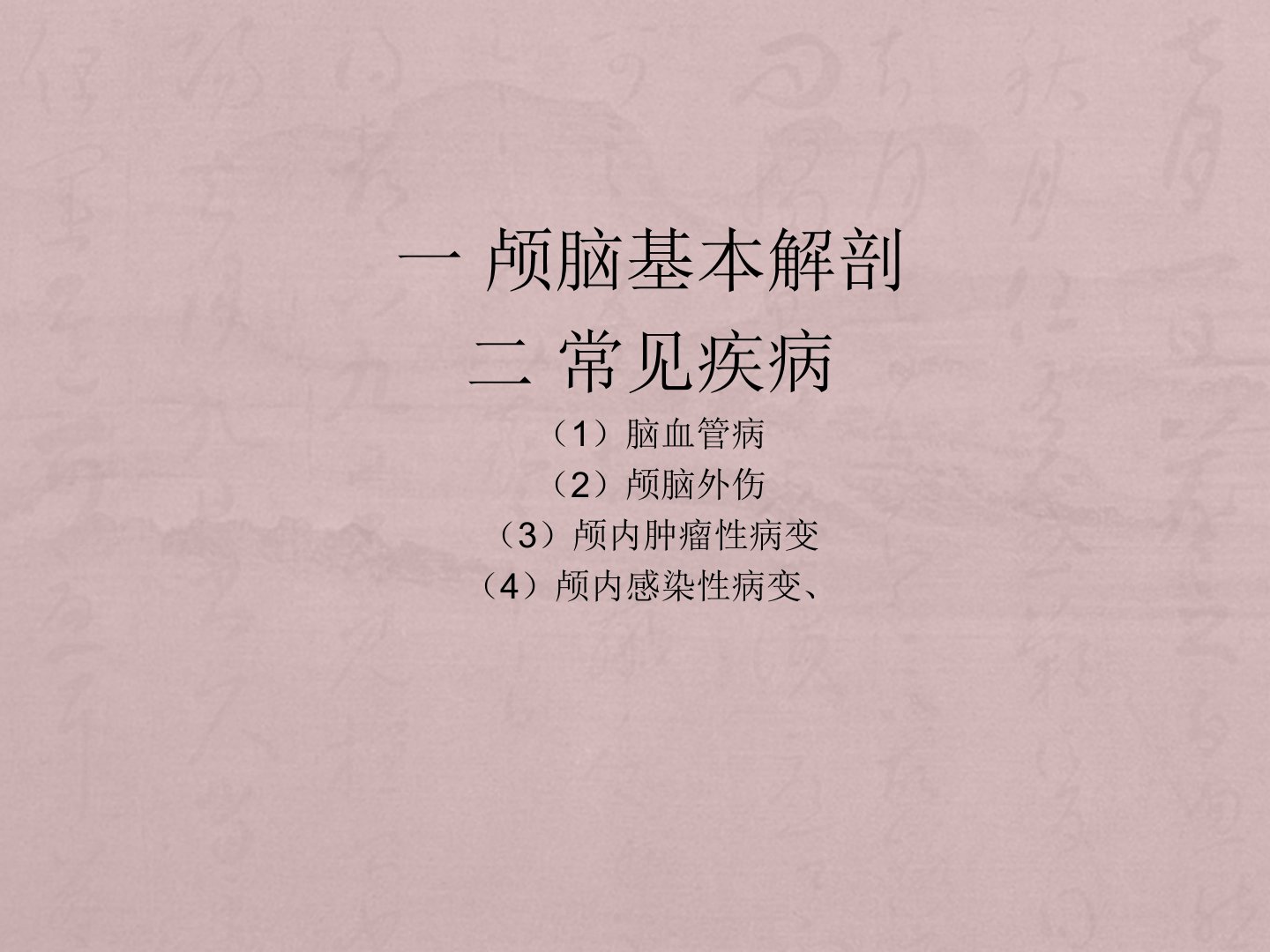一颅脑基本解剖二常见疾病(1)脑血管病(2)颅脑外伤(3)颅内肿瘤性病变(4)颅内感染性病变、蝶窦顶部层面筛窦桥脑小脑中脚小脑蚓小脑半球第四脑室海绵窦颞叶桥小脑角池蝶窦乙状窦基底动脉视神经小脑延髓池鞍上池层面中脑大脑脚外侧裂池额叶直回四叠体池海马环池枕叶脚间池颞叶侧脑室下角小脑蚓下丘第三脑室下部层面额叶纵隔裂侧脑室前角第三脑室上丘四叠体池松果体(钙化)外侧裂池枕叶丘脑岛叶侧脑室后角尾状核头第三脑室上部层面大脑镰额叶胼胝体膝部尾状核头部侧脑室前角透明隔穹窿部丘脑室间孔中间帆池脉络丛外侧裂池枕叶侧脑室三角区视辐射内囊前肢内囊后肢侧脑室体部层面颞叶侧脑室体部放射冠额叶胼胝体压部上矢状窦枕叶胼胝体膝部...