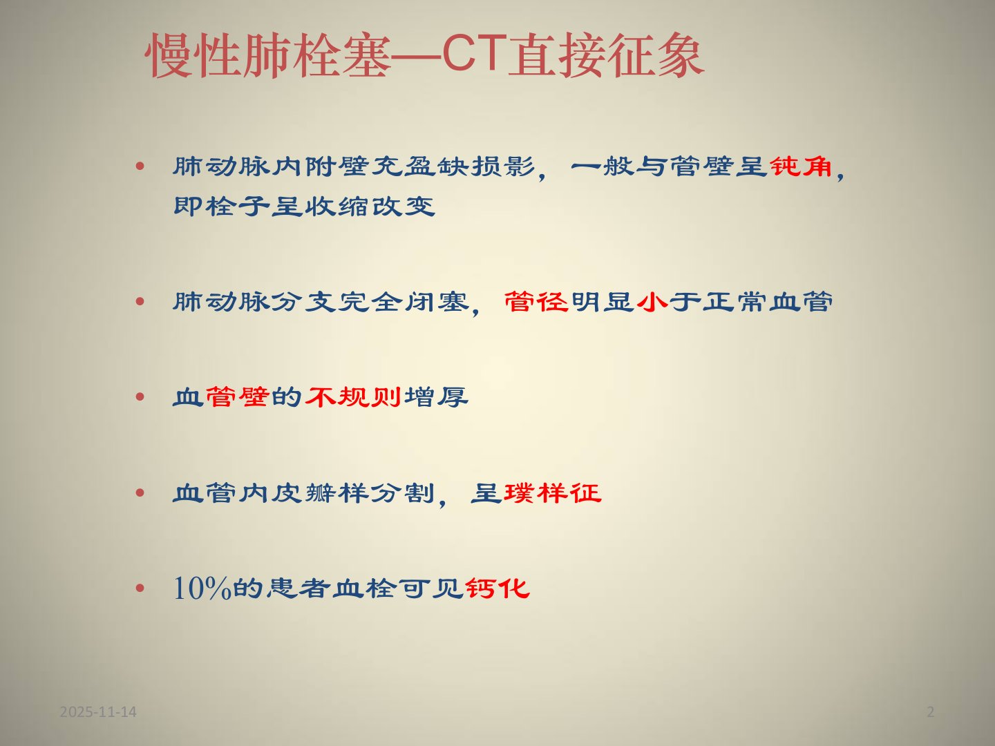 本文介绍了临床医生如何通过CTPA诊断慢性肺栓塞内容涵盖CT直接与间接征象。直接征象包括:肺动脉内附壁充盈缺损影与管壁呈钝角;肺动脉分支完全闭塞管径小于正常;血管壁不规则增厚;血管内皮瓣样分割即璞样征为栓子吸收后残留纤维条索样影位于肺动脉管腔中间或分叉处;10患者血栓可见钙化。间接征象涉及:右心扩大右室壁增厚比例失调;中心肺动脉、支气管动脉扩张;盘状肺不张、条索影、马赛克征;肺动脉扩张附壁充盈缺损与管壁呈钝角;纵膈内支气管动脉迂曲扩张;肺实质Mosaic灌注;室间隔向左心室凸出提示慢性右心功能不全等。