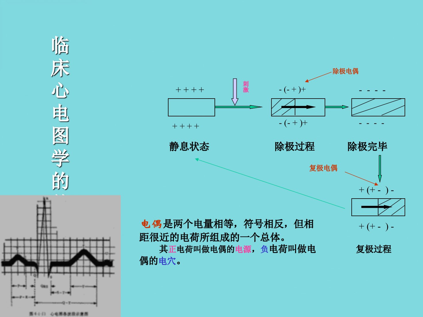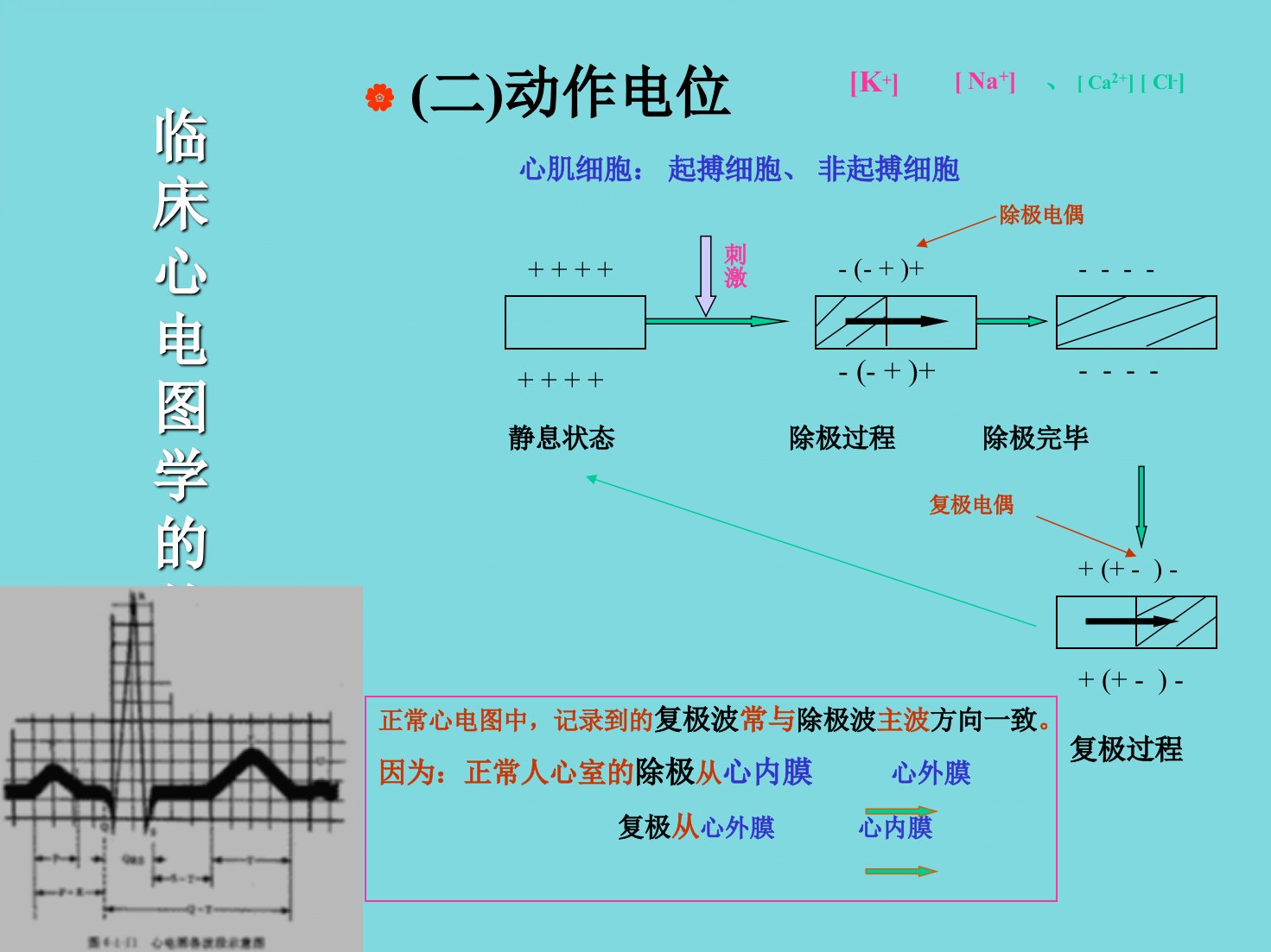 临床心电图基本的知识临床心电图学的基本知识(二)动作电位心肌细胞:起搏细胞、非起搏细胞++++++++刺激-(-+)+-(-+)+静息状态除极过程除极完毕除极电偶--------+(+-)-+(+-)-复极电偶复极过程正常心电图中,记录到的复极波常与除极波主波方向一致。因为:正常人心室的除极从心内膜心外膜复极从心外膜心内膜[Na+]、[Ca2+][Cl-][K+]临床心电图学的基本知识电偶是两个电量相等,符号相反,但相距很近的电荷所组成的一个总体。其正电荷叫做电偶的电源,负电荷叫做电偶的电穴。++++++++刺激-(-+)+-(-+)+静息状态除极过程除极完毕除极电偶--------+(+-)...