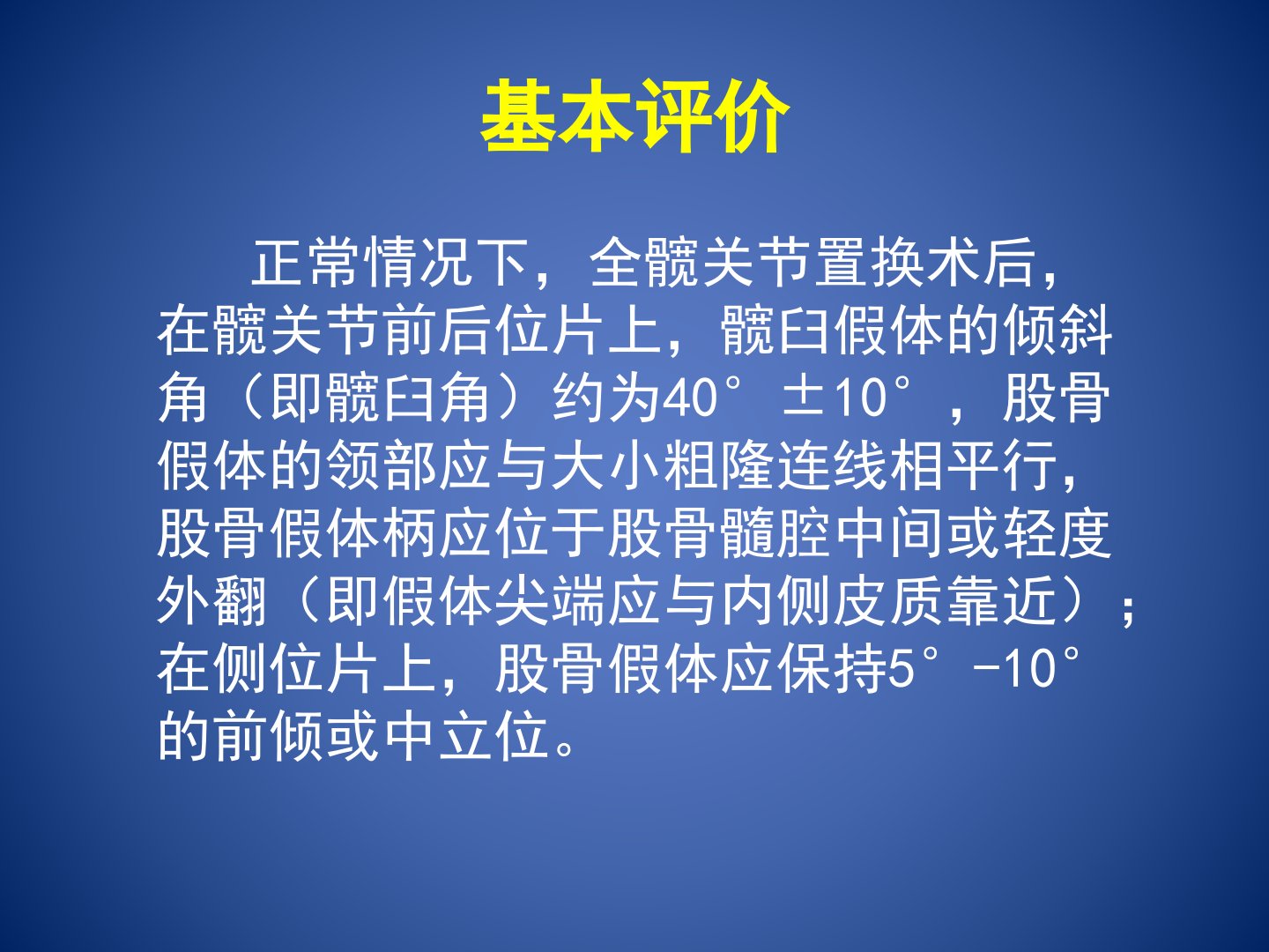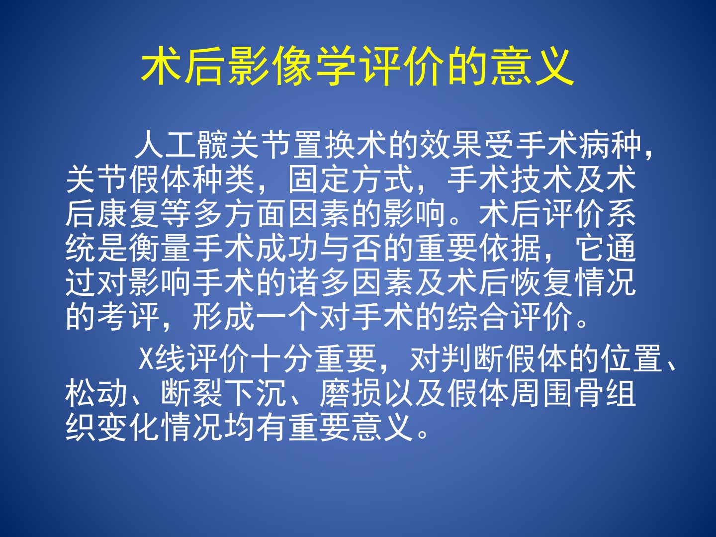 人工髋关节置换术的效果受多方面因素影响术后影像学评价是衡量手术成功与否的重要依据其中X线评价对判断假体情况有重要意义。正常情况下全髋关节置换术后在髋关节前后位片上髋臼假体倾斜角约4010股骨假体领部与大小粗隆连线平行柄位于股骨髓腔中间或轻度外翻侧位片上保持510前倾或中立位。X线测量常用数据指标包括髋臼角、前倾角、髋臼假体内凸程度等。术后合并症有脱位、松动、感染等假体松动放射线征象包括骨水泥与骨界面透亮带、假体移位等。假体周围骨折分型有Vancouver分型基本治疗原则依骨折类型而定。人工全膝关节置换术后X线征象是评价疗效的重要指标拍摄方法包括膝关节正位像、侧位像、髌骨轴位像等正位像观测指标有股骨角、胫骨角等松动判断标准依透亮区宽度而定侧位像观测指标有股骨假体前屈角、胫骨平台假体后倾角等。TKA术后影像学评价意义重大利于总结疗效、预防并发症、改进手术技术。