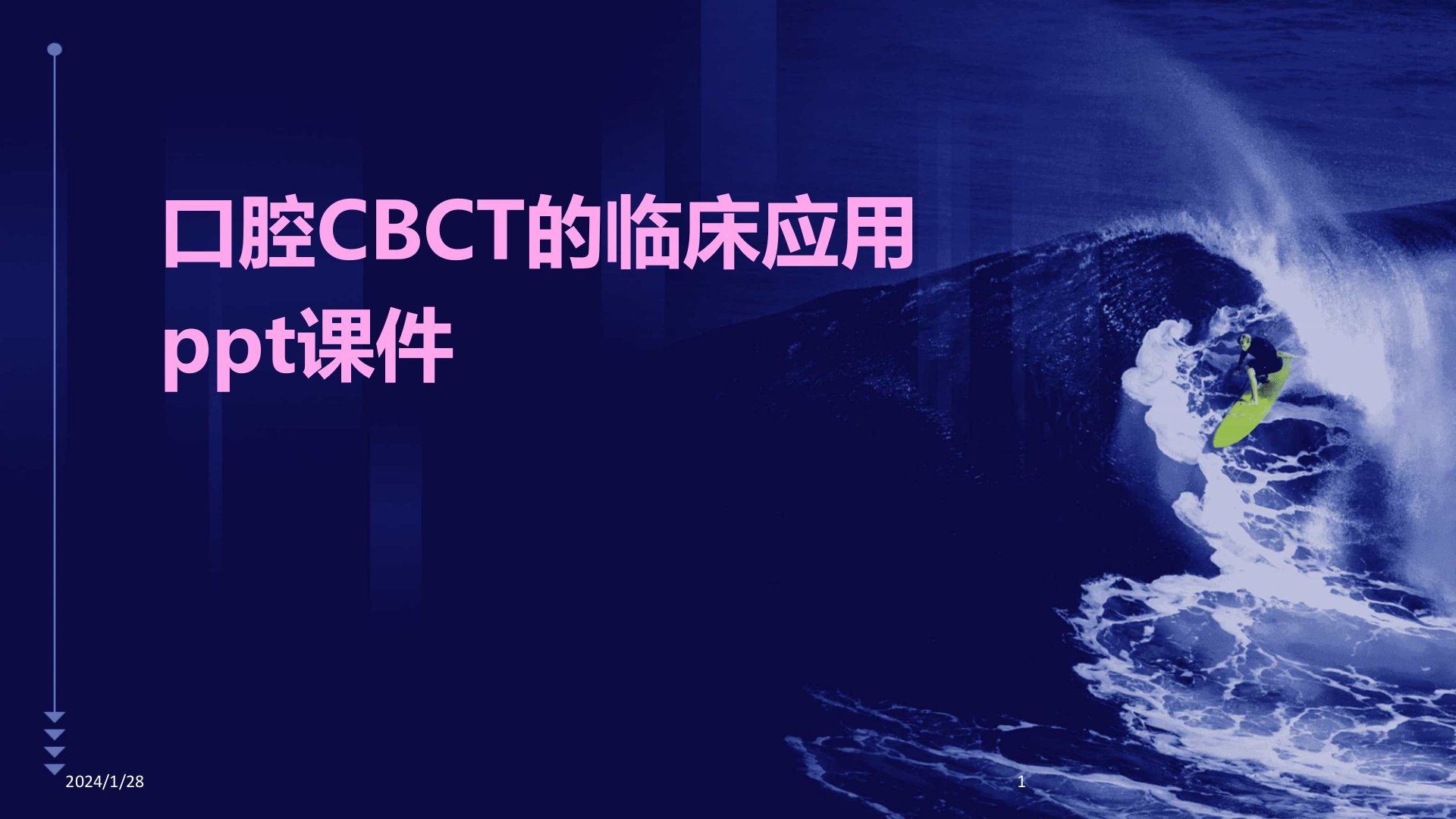 《口腔CBCT的临床应用》摘要本课件详细介绍了口腔CBCT(锥形束计算机断层扫描技术)的临床应用。CBCT利用锥形X射线束旋转扫描经计算机重建得到三维图像自20世纪90年代应用于口腔医学领域后技术不断成熟图像质量和扫描速度显著提升。其优势在于高分辨率、低辐射剂量、快速扫描但也存在视野有限、金属伪影、价格较高等局限。设备方面介绍了X射线源、探测器、旋转机架等关键部件及成像特点。检查流程包括告知患者注意事项、了解病史、去除金属物品、调整体位、选择扫描参数、图像处理与分析及报告书写。CBCT在疾病诊断中应用广泛如颌骨肿瘤、口腔颌面部骨折、颞下颌关节紊乱及种植牙术前评估等。在治疗计划制定和效果评估中CBCT可确定病灶位置和范围、分析牙齿和颌骨结构、优化治疗方案并实现手术路径规划、术中实时导航及术后效果验证。辐射安全方面需遵守国家法规、国际标准和行业规范定期检测设备性能建立质量保证体系培训操作人员落实防护措施并制定应急预案。