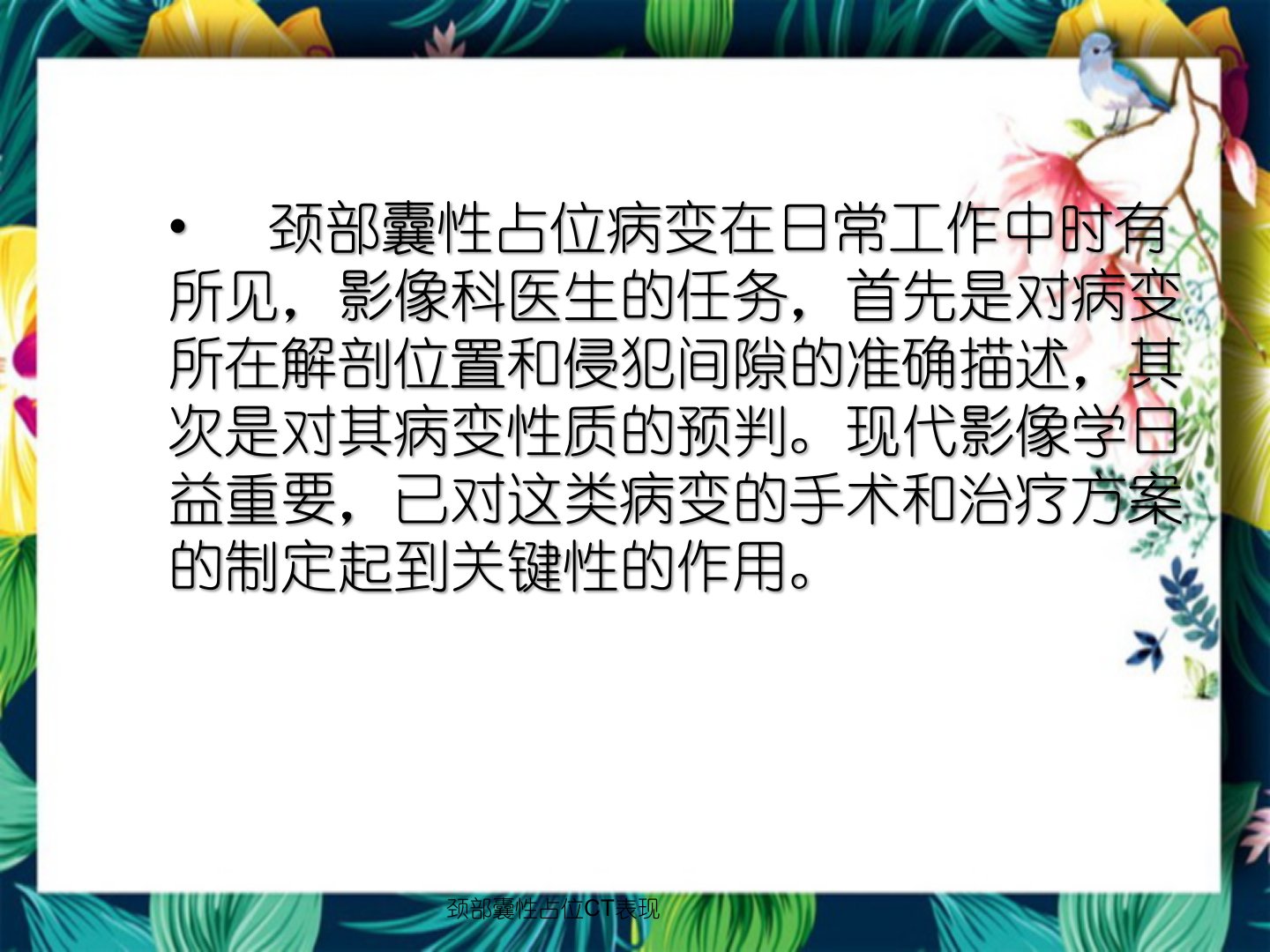 颈部囊性占位病变在日常工作中常见影像科医生需准确描述病变位置、侵犯间隙并预判病变性质现代影像学对此类病变的手术和治疗方案制定起到关键作用。徐坚民等对44例颈部囊性肿块分析显示包括淋巴结病变、腺体病变、神经鞘瘤、脓肿及多种先天性囊肿。CT表现上先天性囊性占位如甲状舌管囊肿多位于颈部中线发病率占颈部先天性病变70表现为光滑薄壁肿块、黏液密度;鳃裂囊肿多见于胸锁乳突肌前壁薄光滑;淋巴水瘤(囊性淋巴管瘤)好发于2岁前儿童生长缓慢呈葡行性CT显示有分隔相互连通、无定型囊性肿物;皮样囊肿常位于口底部CT表现为中等大小薄壁肿块。后天性囊性肿块中囊性淋巴结转移、淋巴结核、脓肿等各有特征性CT表现。