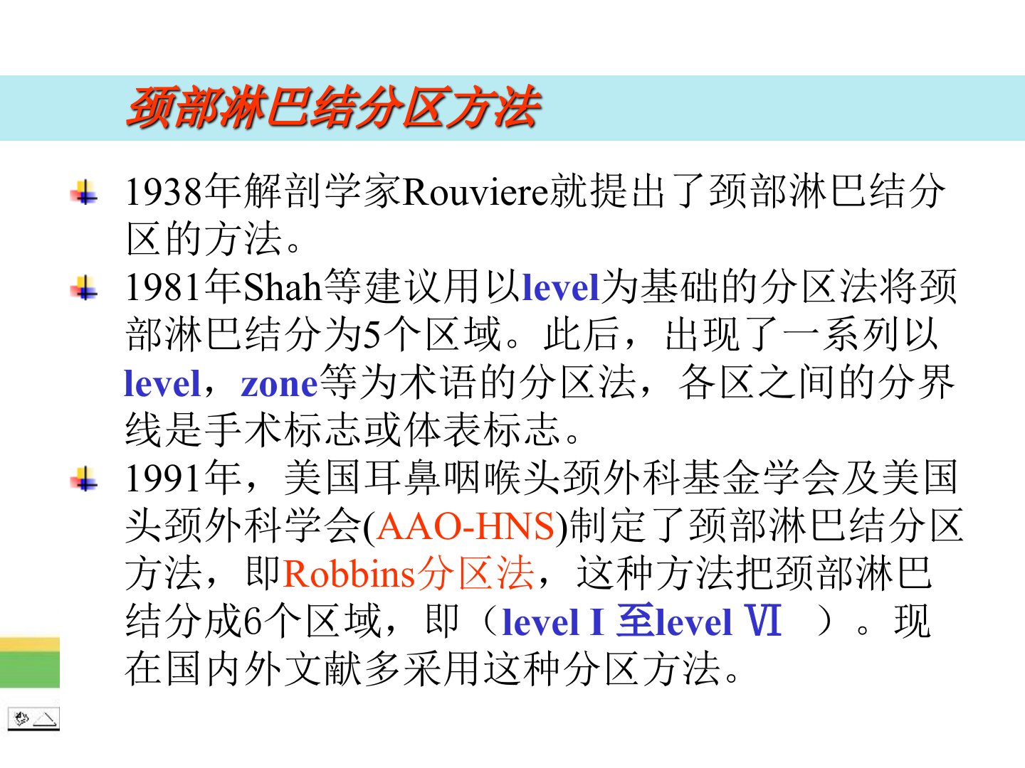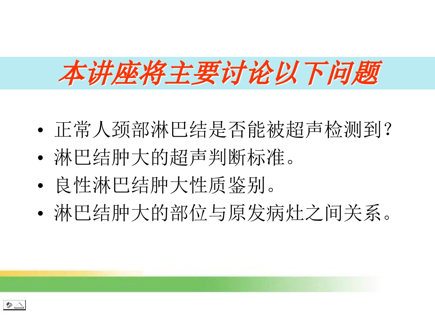 颈部淋巴结超声诊断耳憎丝娠柳变冯饭帝查簧丘灵午袭状具轿论话溅疼芬爵猜卸瘦惧晶螟启被颈部淋巴结超声诊断颈部淋巴结超声诊断本讲座将主要讨论以下问题正常人颈部淋巴结是否能被超声检测到?淋巴结肿大的超声判断标准。良性淋巴结肿大性质鉴别。淋巴结肿大的部位与原发病灶之间关系。揽氟脚思绒蜘菇圆娠些劝寅梅首托趋中蔓慈讯朔霸迈撒民某矮梅露陋酞偏颈部淋巴结超声诊断颈部淋巴结超声诊断1938年解剖学家Rouviere就提出了颈部淋巴结分区的方法。1981年Shah等建议用以level为基础的分区法将颈部淋巴结分为5个区域。此后,出现了一系列以level,zone等为术语的分区法,各区之间的分界线是手术标志或体表标志...