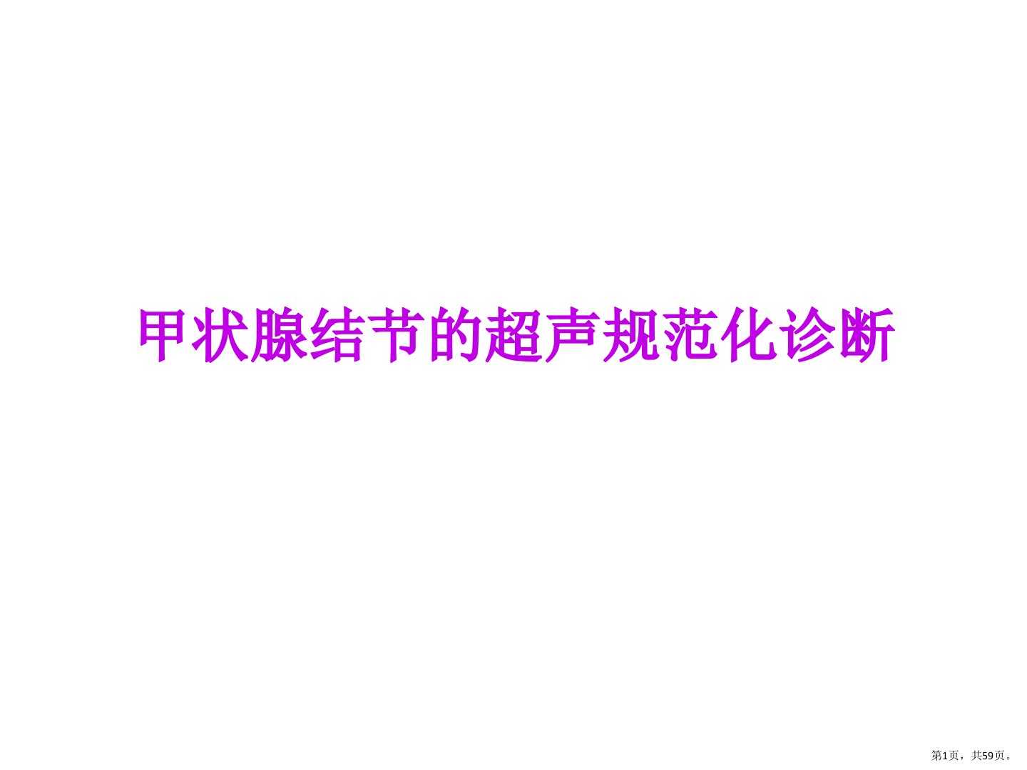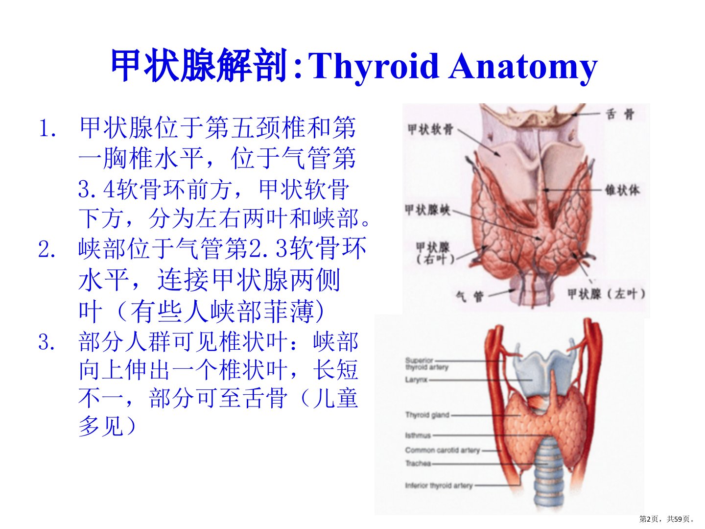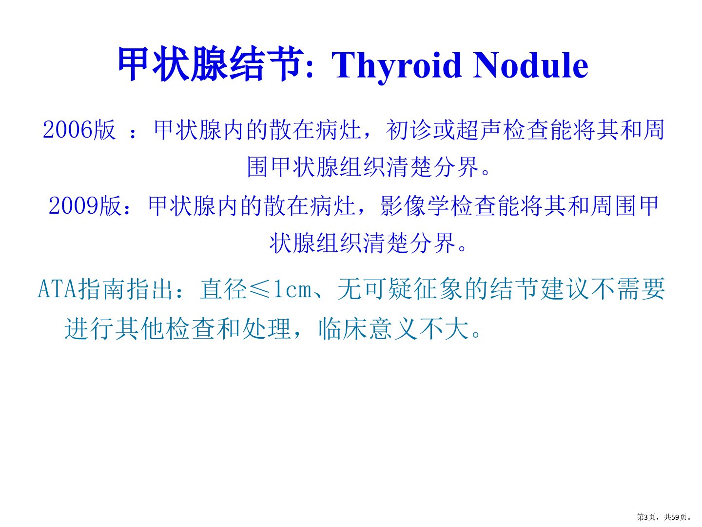 甲状腺结节的超声规范化诊断第1页,共59页。甲状腺位于第五颈椎和第一胸椎水平,位于气管第3.4软骨环前方,甲状软骨下方,分为左右两叶和峡部。峡部位于气管第2.3软骨环水平,连接甲状腺两侧叶(有些人峡部菲薄)部分人群可见椎状叶:峡部向上伸出一个椎状叶,长短不一,部分可至舌骨(儿童多见)甲状腺解剖:ThyroidAnatomy第2页,共59页。甲状腺结节:ThyroidNodule2006版:甲状腺内的散在病灶,初诊或超声检查能将其和周围甲状腺组织清楚分界。2009版:甲状腺内的散在病灶,影像学检查能将其和周围甲状腺组织清楚分界。ATA指南指出:直径≤1cm、无可疑征象的结节建议不需要进行其他检查...