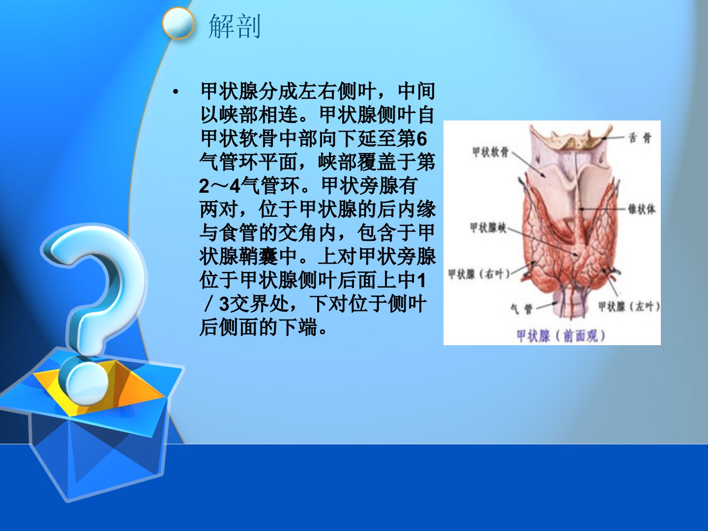 甲状腺分为左右侧叶中间以峡部相连甲状旁腺有两对位于甲状腺后内缘。CT扫描通常采取横断面层厚5mm连续扫描常规应用造影剂增强扫描。正常甲状腺含碘量高、血供丰富CT值范围达79Hu126Hu与周围组织结构间隙显示清楚可显示病变与周围组织关系已广泛应用于临床诊断甲状腺肿瘤。甲状腺疾病常见类型包括甲亢、甲低、甲状腺瘤、甲状腺炎等。甲状腺炎以炎症为主分为多种类型其中桥本氏甲状腺炎最常见CT表现为甲状腺侧叶及峡部弥漫增大边缘规则锐利密度较均匀且低于正常甲状腺。亚急性甲状腺炎有一定特征性CT表现为甲状腺体积肿大病变处边缘模糊。结节性甲状腺肿CT显示甲状腺弥漫性增大可见散在性大小不一的低密度结节。甲状腺腺瘤多为单发有完整包膜CT平扫呈圆形或类圆形低密度灶增强扫描可见瘤组织周边显示完整的强化环。甲状腺癌是最常见的甲状腺恶性肿瘤CT表现边缘大多规则有明显强化且常有钙化多单发活动度差晚期可侵犯邻近脏器。