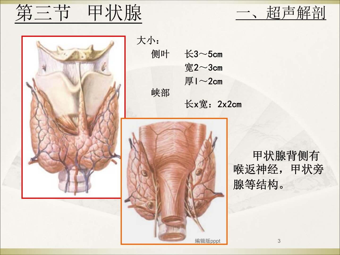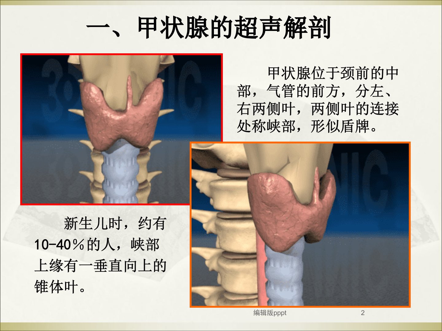 甲状腺超声诊断摘要甲状腺位于颈前中部气管前分左右叶连接处为峡部形似盾牌。新生儿中约1040的人峡部上缘有锥体叶。甲状腺侧叶长35cm宽23cm厚12cm峡部2x2cm背侧有喉返神经和甲状旁腺被两层被膜包裹后外为颈总动脉及颈内静脉包绕气管及食管。超声检查前病人一般无需特殊准备充分暴露颈前部即可。检查时仰卧位为常规体位头低颈高位;甲状腺一侧明显肿大时可采用侧卧位。常规先横切再纵切测量各径线大小并在感兴趣区多切面扫查最后用彩色多普勒血流显像观察血流分布频谱多普勒测量血流参数。正常甲状腺边界清楚包膜完整呈蝶形或马蹄形实质回声中等偏高可随吞咽上下移动。甲状腺病变可分为甲状腺肿、甲状腺炎和甲状腺肿瘤三类。甲状腺肿包括甲亢、单纯性甲状腺肿等;甲状腺炎有亚急性甲状腺炎和慢性淋巴性甲状腺炎;甲状腺肿瘤包括腺瘤和癌等。各类病变具有不同声像图特点超声探测可提供诊断线索。