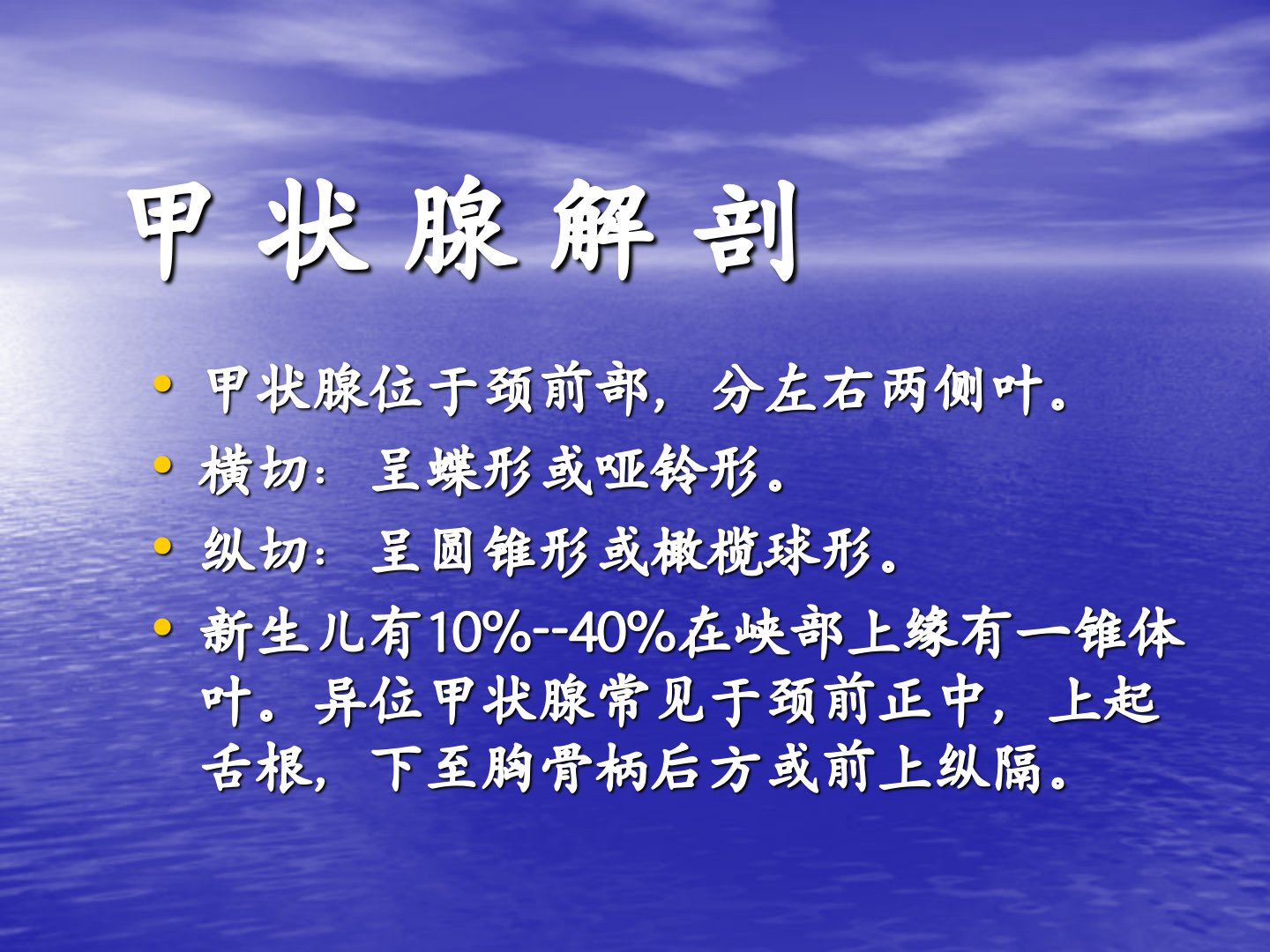 甲状腺位于颈前横切呈蝶形或哑铃形纵切呈圆锥形或橄榄球形新生儿在峡部上缘有锥体叶。其周围有皮肤、皮下脂肪、肌肉、血管、神经等结构内有四个甲状旁腺。甲状腺血管分布包括甲状腺上动脉、甲状腺下动脉内径1525mm静脉与同名动脉伴行但方向相反。检查时可用线阵式高频探头患者检查前一般无须准备充分暴露颈前部即可可用直接法或间接法检查。正常甲状腺声像图具有特定表现正常值上下径4055mm左右径2025mm前后径1520mm峡部0306mm。甲状腺疾病适应证包括甲状腺肿、甲状腺炎、甲状腺肿瘤等不同疾病声像图有不同特征。甲状腺疾病鉴别诊断方面弥漫性肿大、结节性改变各有不同病因。良恶性结节可通过囊性无回声团、钙化、血流等情况鉴别。介入性超声可用于诊断和治疗甲状腺疾病。
