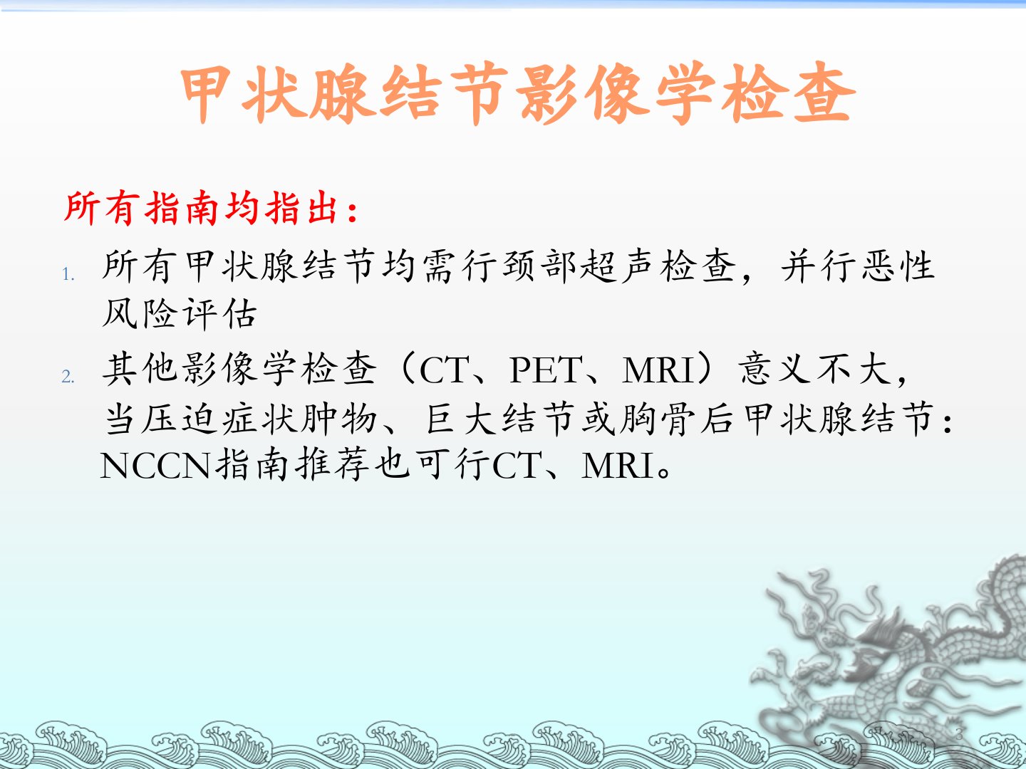 甲状腺超声解读要点如下:所有甲状腺结节均需行颈部超声检查进行恶性风险评估CT、PET、MRI等检查意义不大但在特定情况下(如压迫症状、巨大结节等)NCCN指南推荐也可行CT、MRI检查。甲状腺大小有测定标准大于径线考虑甲状腺肿小于径线则多见于甲减、先天异常或术后改变。超声评估甲状腺结节需关注部位、数目、大小、纵横比、形态、边界等多个方面。其中恶性结节以甲状腺中部多见但病灶部位对良恶性鉴别无意义;结节纵横比(AT)大于1多见于恶性结节;形态上直立状和不规则形多见于恶性结节;边界模糊和边缘不光整也提示恶性可能;内部结构上极低回声多见于恶性结节但诊断特异性并非100;微钙化、簇状钙化等常提示恶性而浓缩胶质则代表良性。此外结节被膜连续性中断和中央型血流也提示恶性可能。最后文章还列举了五个病例展示了不同超声特征下的病理结果。