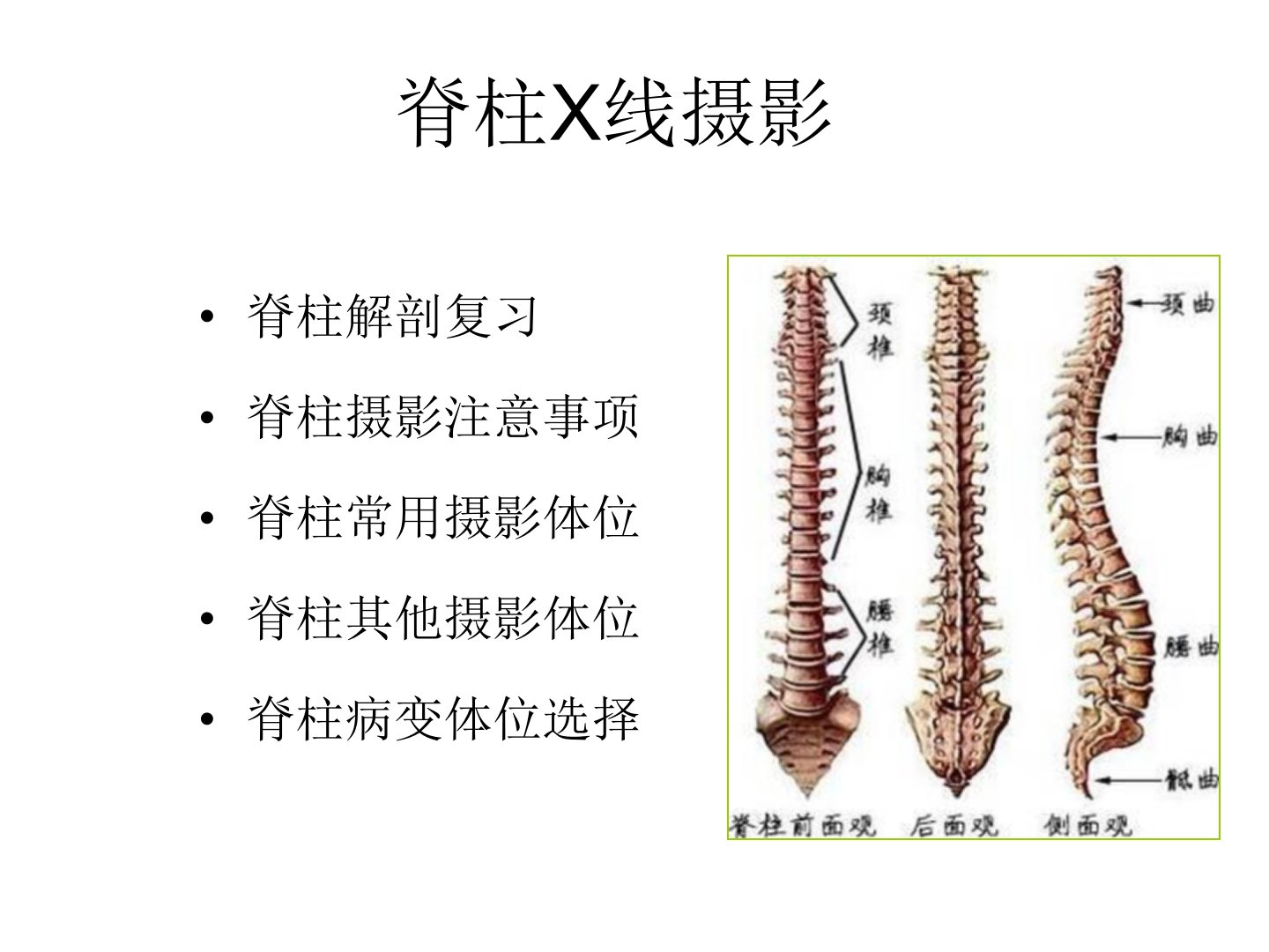 脊柱X线摄影需注意:摄影前医生应详阅申请单、询问病情正确选择摄影体位同时去除被摄部位体表不透X线的物品;腰椎等摄影前需询问用药和检查史骶尾椎摄影前应先行排便。摆放体位时要熟悉脊柱解剖避免人为弯曲和椎体影像重叠对脊柱外伤患者要避免损伤脊髓或血管尽量减少对病人的搬动。摄影应包含邻近有明确标志的椎骨组织差异大的部位可分段摄影。腰椎摄影让患者深呼气后屏气再曝光其他多为平静呼吸下屏气。脊柱摄影管电压高需用滤线器注意对被检者的X线防护。不同部位有不同胶片尺寸和摄影要点如第37颈椎前后位被检者仰卧或立位按特定角度和位置曝光;颈椎侧位被检者侧立双手持沙袋按特定要求曝光;胸椎、腰椎、骶尾椎等也有各自正位、侧位的摄影体位和显示要求。