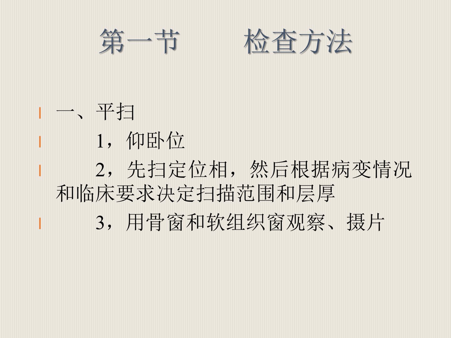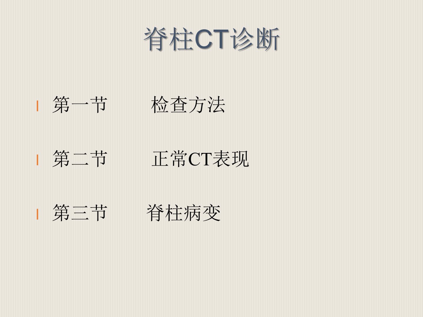 脊柱CT诊断第一节 检查方法第二节正常CT表现第三节脊柱病变第一节 检查方法一、平扫1,仰卧位2,先扫定位相,然后根据病变情况和临床要求决定扫描范围和层厚3,用骨窗和软组织窗观察、摄片二、增强观察病变有无强化三、脊髓造影后扫描(CTM)主要用于椎管内病变的发现和定位第二节正常CT表现一、脊柱骨质结构椎体和附件,用骨窗观察。表面的骨皮质表现为均匀致密线影,内部骨松质密度较低,且不均匀,其内可见骨小梁结构,有时见低密度的椎基V的血管沟二、椎间盘CT表现为与相邻椎体形态、大小一致、密度均匀的软组织影(80~120HU)颈段:圆形,后缘平直胸段:后缘深凹腰段:后缘浅凹L5/...