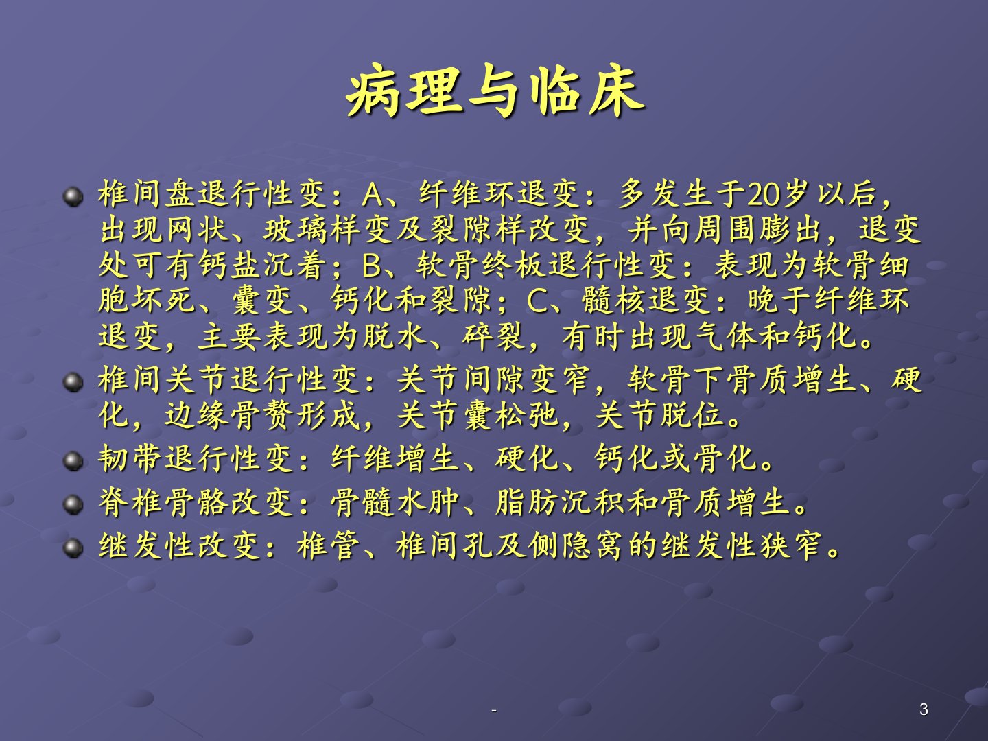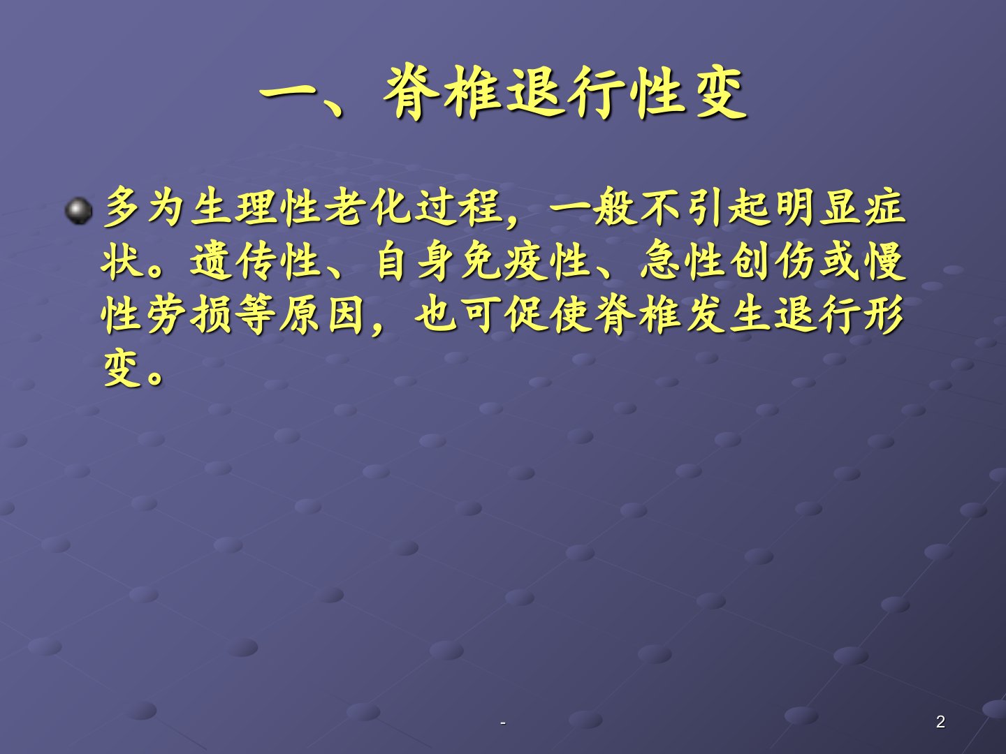 第六章脊柱-一、脊椎退行性变多为生理性老化过程,一般不引起明显症状。遗传性、自身免疫性、急性创伤或慢性劳损等原因,也可促使脊椎发生退行形变。-病理与临床椎间盘退行性变:A、纤维环退变:多发生于20岁以后,出现网状、玻璃样变及裂隙样改变,并向周围膨出,退变处可有钙盐沉着;B、软骨终板退行性变:表现为软骨细胞坏死、囊变、钙化和裂隙;C、髓核退变:晚于纤维环退变,主要表现为脱水、碎裂,有时出现气体和钙化。椎间关节退行性变:关节间隙变窄,软骨下骨质增生、硬化,边缘骨赘形成,关节囊松弛,关节脱位。韧带退行性变:纤维增生、硬化、钙化或骨化。脊椎骨骼改变:骨髓水肿、脂肪沉积和骨质增生。继发性改变:椎管、椎间...