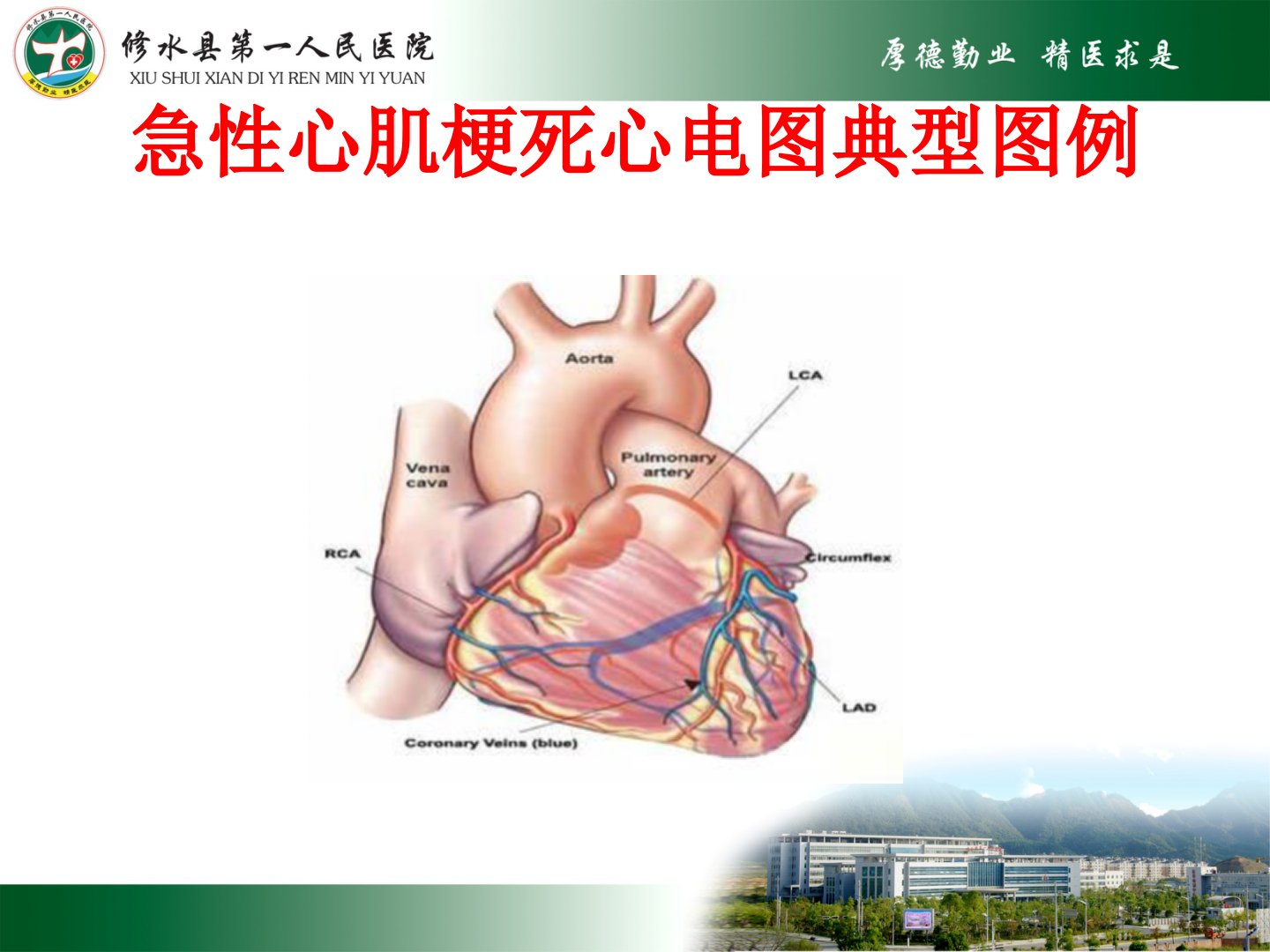 修水县第一人民医院心内科程贵胜介绍了急性心肌梗死心电图及常见异常心电图的识别。内容涵盖急性下壁、右室及正后壁心肌梗死心电图特征及复查变化如II、III、aVF导联ST段回落、T波变浅等;急性前壁系列心肌梗死包括急性广泛前壁、下壁心肌梗死不同时间的心电图表现如ST段抬高形态变化、Q波改变等还提及一患者因胸闷不适就诊初次心电图未考虑心肌梗死四天后复查符合心肌梗死心电图演变特征。此外还介绍了常见异常心电图识别如室上性、室性、房性期前收缩特点;阵发性室上性、室性心动过速特征;心房扑动、颤动波形及危害;心室扑动与颤动的严重性;心脏传导阻滞按部位和严重程度的分类及特征如窦房传导阻滞、房室传导阻滞等。