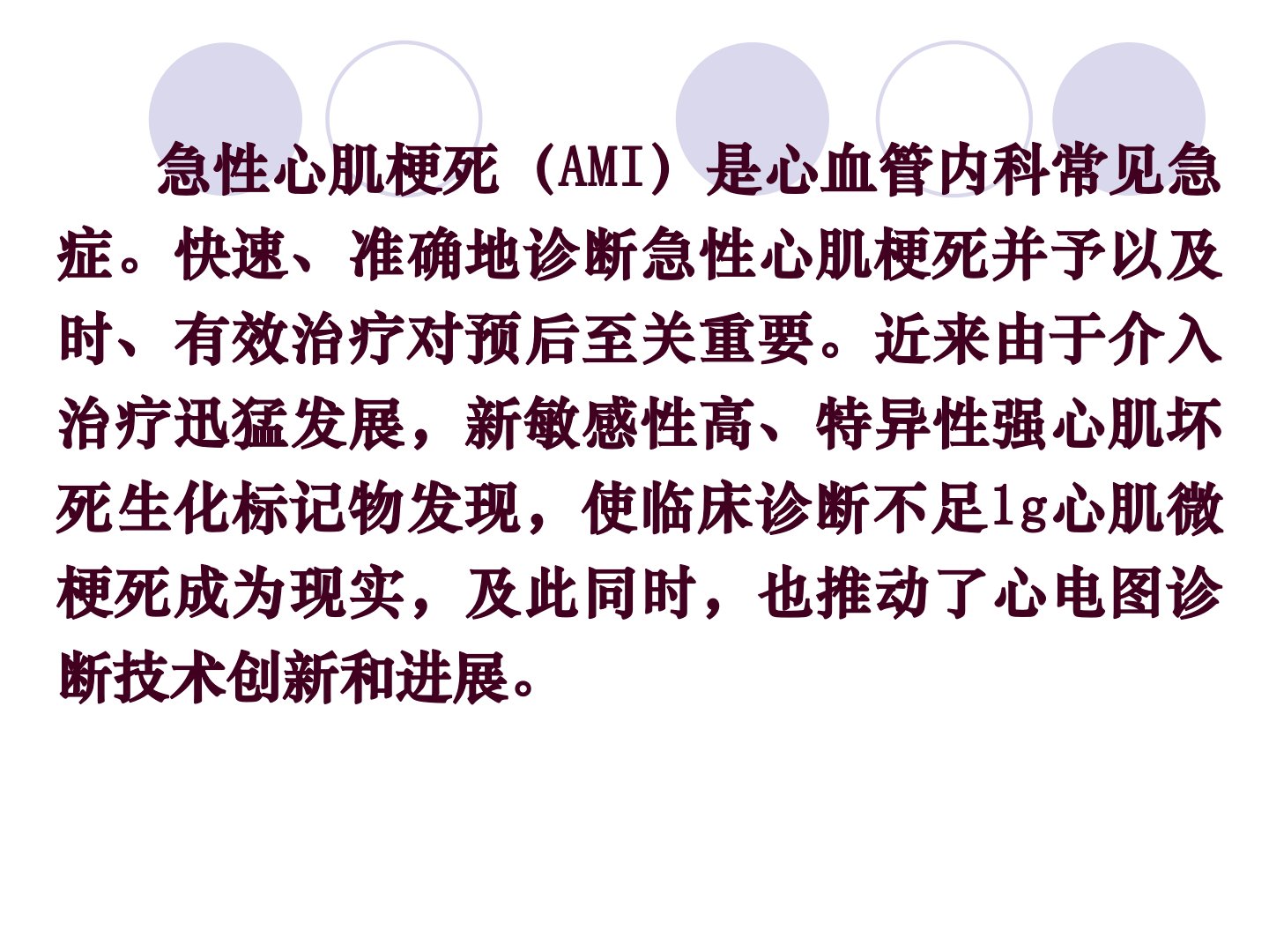 急性心肌梗死心电图新进展a急性心肌梗死(AMI)是心血管内科常见急症。快速、准确地诊断急性心肌梗死并予以及时、有效治疗对预后至关重要。近来由于介入治疗迅猛发展,新敏感性高、特异性强心肌坏死生化标记物发现,使临床诊断不足1g心肌微梗死成为现实,及此同时,也推动了心电图诊断技术创新和进展。主要内容急性心肌梗死诊断模式从3:2模式转变1+1模式急性心肌梗死诊断模式①缺血性胸痛病史;②心电图动态变化(有ST段动态变化和Q波);③血清心肌坏死标记物动态变化(升高及回落)。传统诊断标准3:2模式以上3个条件中符合2个条件时,则可诊断心肌梗死。急性心肌梗死诊断新模式随着对心肌坏死更敏感和特异性更高生化标志物...
