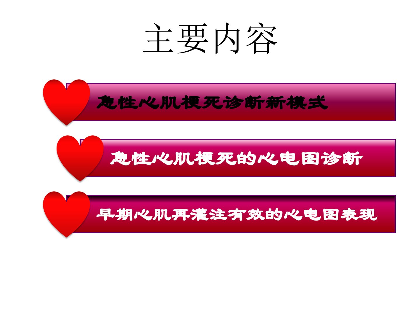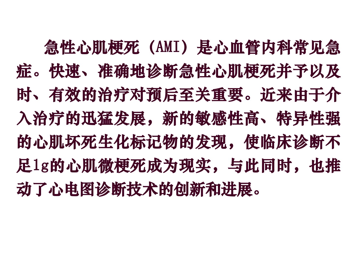 急性心肌梗死(AMI)是心血管内科急症快速准确诊断对预后至关重要。随着介入治疗和心肌坏死生化标记物的发展心电图诊断技术也在进步。AMI诊断模式从3:2模式转变为11模式即心肌缺血症状、新出现病理性Q波、ST段抬高或压低、影像学证据等4项中符合1项且心肌坏死生化标记物(肌钙蛋白、CKMB)必须呈动态变化。新模式提高了心梗临床诊断敏感性使微梗死诊断成为现实。但心电图对AMI的诊断作用仍不可取代因标记物升高有时间段限制在超急性期和急性期不如心电图敏感及时。心电图可分类为ST段抬高型和非ST段抬高型其图形随心肌缺血、损伤、坏死的发展和恢复而演变。非ST段抬高型急性心肌梗死的心电图诊断依据为新发生的STT改变持续24小时以上主要依据临床症状、心电图改变及心肌生化标记物诊断。ST段抬高型急性心肌梗死的心电图基本改变包括T波、ST段及Q波改变其中ST段抬高是早期诊断和再灌注治疗选择的重要依据。急性心肌梗死后614h多数患者心电图出现病理性Q波但病理性Q波原因包括心肌坏死和心肌顿抑。急性心肌梗死心电图定位诊断主要依据坏死图形但损伤性ST段抬高是早期诊断、分类和指导治疗的重要依据。急性右心室肌梗死约占1